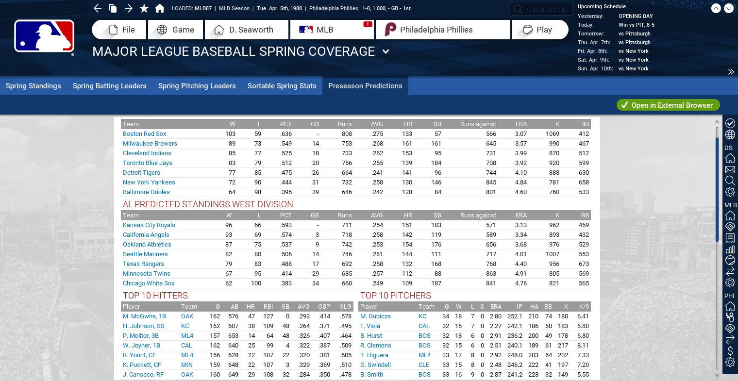 Baseball Network News (BNN) released its annual preseason predictions on the opening day and they do not like the moves I made this year. Division Winner Predictions: AL East - Red Sox (103-59) AL West - Royals (96-66) NL East - Mets (99-63) NL West - Padres (97-65) They had the Phillies at 60-102 and the worst team in the majors. Screw that. We won 75 games last year and only lost Juan Samuel. He is good but not worth that many games. I think we are around a 75 win team again. We moved up from the worst minor league system to the 20th. We have three players in the top 100. The top system is the New York Yankees, who have 5 top #100 prospects including # 1 SS Bernie Williams Top Phillies Prospects: #48 SP Kevin Appier #52 SS Walt Weiss #66 RF Keith Miller |