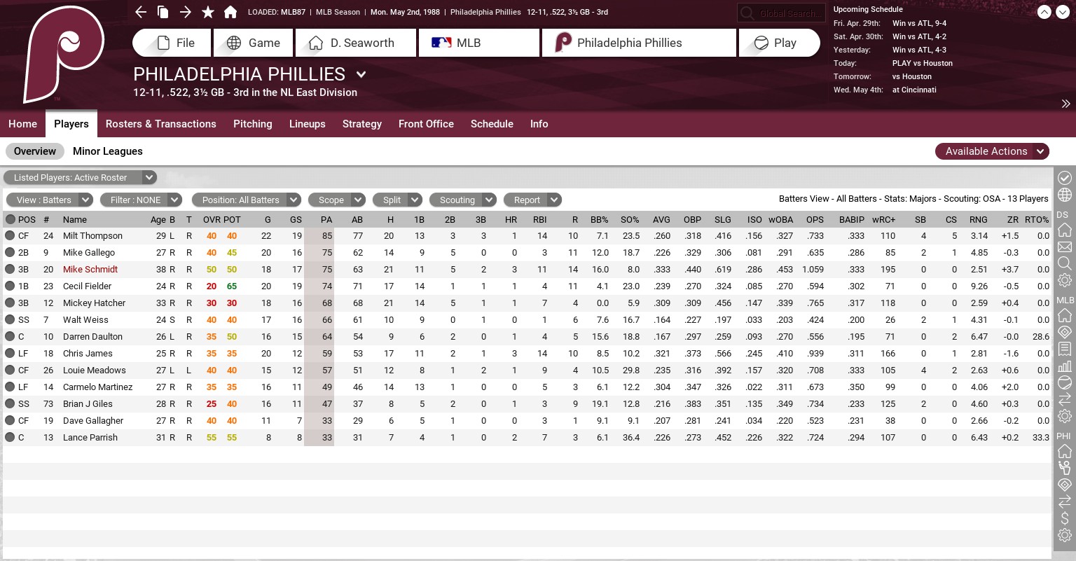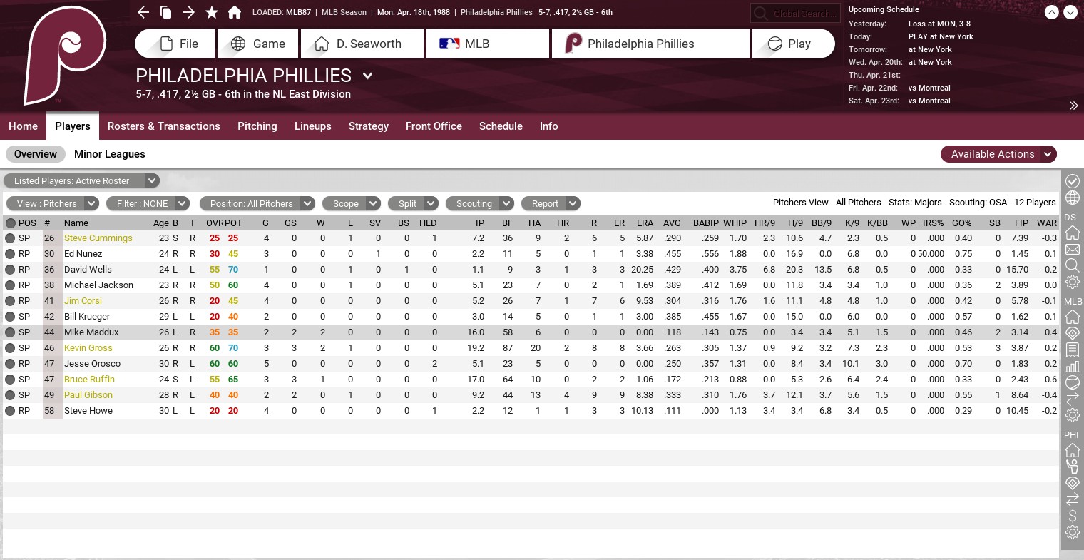 Notes: We begain the week against one of the teams worse than us, the San Francisco Giants. We took the first game 3-2, behind another strong outing from Steve Cummings, 6 Ip, 2 ER, 4K. Rookie Keith Miller chipped in two 2Bs and run. We lost the second game, 2-1. Kevin Gross (6 IP, 2 ER, 3 Ks) and Bill Krueger (2 IP, 1 hit, 1 K) pitched great, but the offense was held to 4 hits. We flashed some power in taking the finale, 6-2, as Mike Schmidt, Lance Parrish and Cecil Fielder all went yard. Then we were swept by the San Diego Padres, losing 4-3, 5-4 and 10-1. In game 1, Tom Newell made his major league debut, giving up 3 runs on 4 hots, 5 walks and 2 Ks. The walks need to come down. Lance Parrish had 2 hits including a HR. THe second game went 13 innings. Bruce Ruffin pitched well (5 IP, 2 ER, 4 H, 2 BB, 5 K). THe bullpen went 7.2 IP, 3 ER, 6 hits, 2 BB, with Nunez blowing the save. I needed to shake up the roster as some of my younger players, Mike Gallego, Walt Weiss, Darren Daulton and Brian Giles to name a few, have struggled. I wanted to cut salary and shop some of my veterns. The Boston Red Sox were interested in Mickey Hatcher, which opened up talks between. I asked for a young RF Mickey Pina, a 22 year old, who hit .287 with 6 HR at AAA this season.He's an average defend with an average eye, contact and power. He may turn onto a 4th OF later this year or next year. I then asked the BostonGM, if RP Curt Schilling was available and he was. After some back and forth, it cost me Jesse Orosco, who was an upcoming FA, Lance PArrish, who was making 1.5 M and hitting .240, Brian Giles (.184, 2 HR, 4 RBIs, 3 SB, .662 OPS) who has struggled to reach his potential and Carlos Martinez (.245, 0 HR, 7 RBI, 1 SB, .591 OPS). He was the one I tried to keep, but Boston's GM insisted on him. I put both new players on the 40 man roster along with Tom Barrett. I assigned Pina to AAA Maine and Schilling to Philadelphia. I purchased the contracts of Varsho, Tom Prince, Dave Gallagher and Tom Barrett |