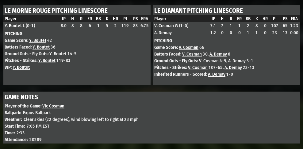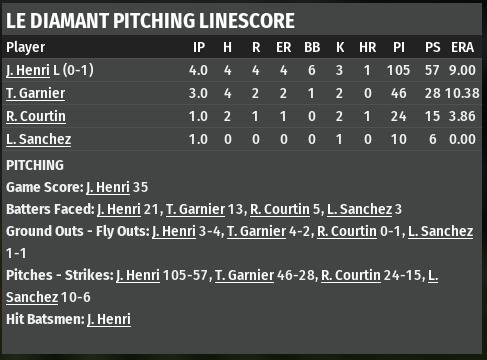 Vic Cosman gave Le Diamant another quality outing earning his 2nd win of the season as the Diamonds even their record at 3-3.