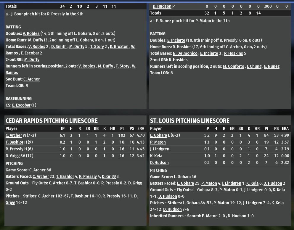 Starting pitcher Chris Archer pitched into the seventh inning and Matt Duffy drove in both of his team's run as Cedar Rapids defeated St. Louis 2-1 at Busch Stadium. Duffy put the Golden Grapplers up top in the top of the second inning wiht a solo homer off River Walkers starting pitcher Luis Gohara. He later made it 2-0 in the sixth inning with an RBI single, also off Gohara. His hit scored Trevor Story had singled with two outs, and moved to second on an Eduardo Escobar single. St. Louis did get a run off Archer in the bottom of the sixth on a solo homer from Rhys Hoskins. For the game, Archer (7-2) allowed the one run on three hits in 6.1 innings. He struck out four and walked one. Tyler Bashlor got the final two outs of the seventh for Cedar Rapids. Ryan Pressley tossed a scoreless eighth and Danny Grigg handled the ninth for his 17th save. |