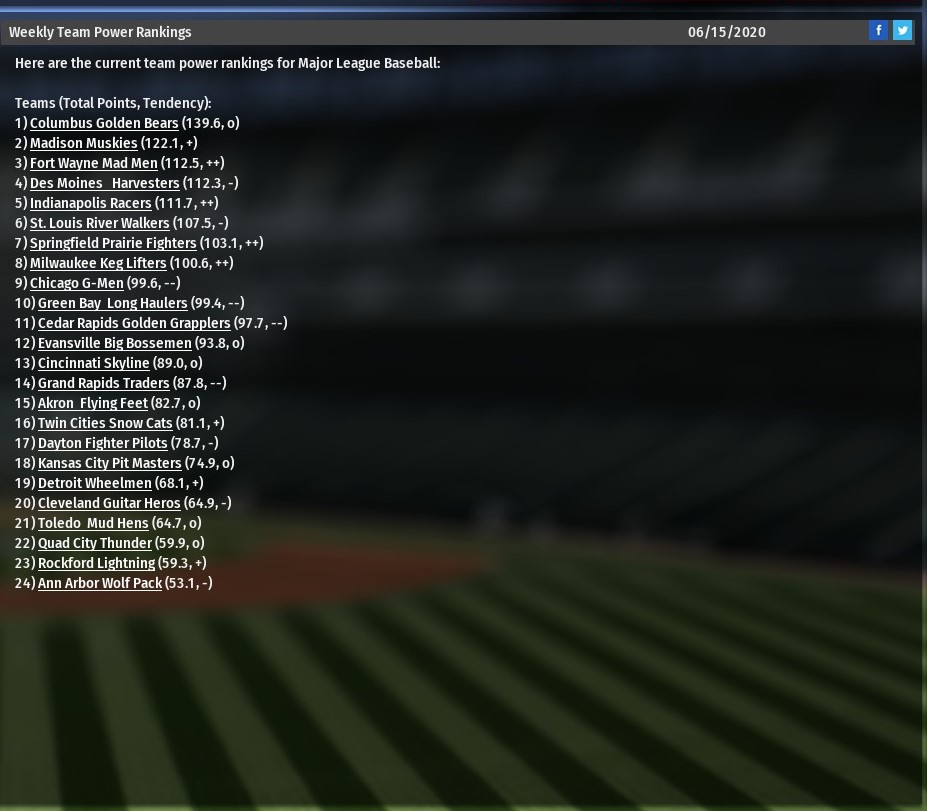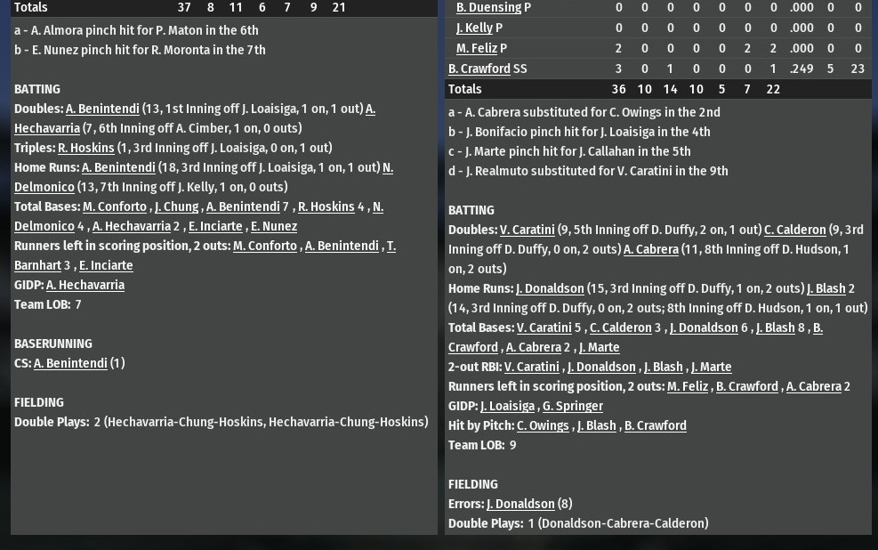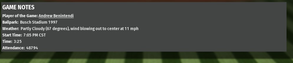 Jung-hwan Chung homered twice and drove in seven runs as St. Louis routed Chicago 19-6 at Wrigley Field (1979). The lopsided win was the second in a row of the River Walkers, who took the second game of their series 10-1. St. Louis jumped on the G-Men for four runs in the top of the second, with Chung providing the big hit a three-run homer off starting pitcher Shohei Ohtani. His second homer came much later in the game, by which time St. Louis had the game well in-hand, his grand slam proving the Walkers' final four runs of the game. St. Louis starter Kyle Hendrick posted a strong outing allowing one run on six hits over six innings. He struck out five and walked one. The Walkers bullpen didn't have its best day -- especially Bobby Poyner and Kelone Kela who combined to allow five innings in just 1.1 innings -- but it didn't really matter in game where their team scored 14 runs between the sixth and eighth innings. |