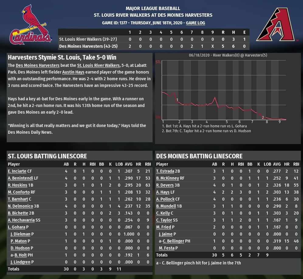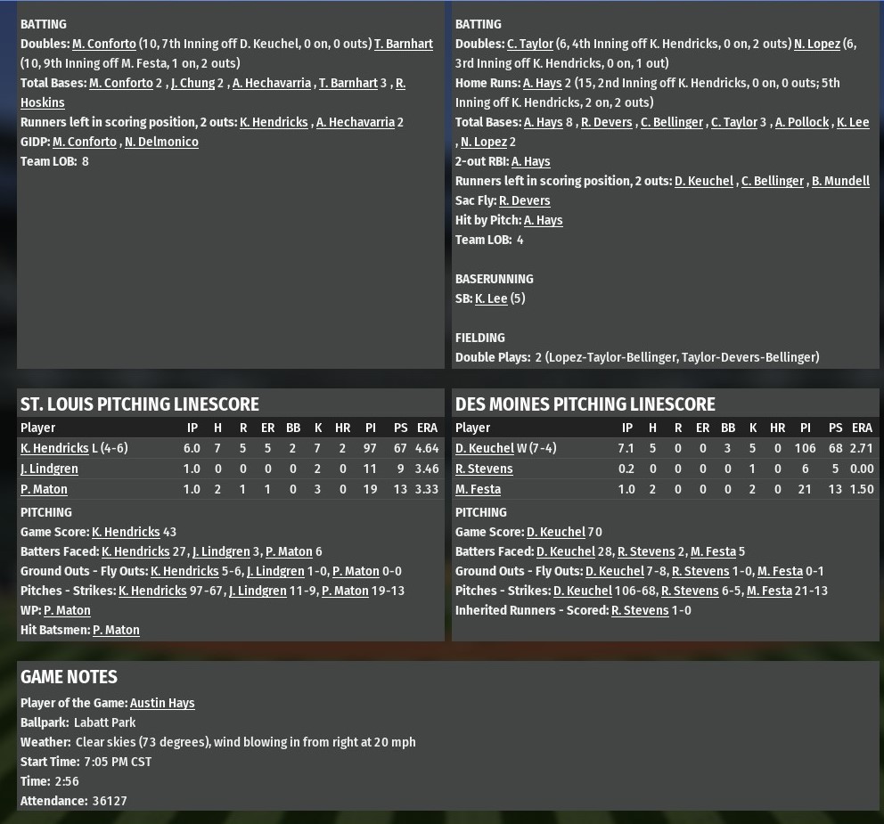 Austin Hays hit two of Des Moines' three home runs and Max Fried and a pair of relievers combined on a three-hit shutout as the Harvesters downed St. Louis 5-0 in the opener of a four-game series between the top two teams in the National League West at LaBlatt Stadium. Hays hit the first of his two homers in the bottom of the first, a two-run blast which happened to mark the end of River Walkers starting pitcher Luis Gohara's day. Gohara departed after the at-bat with neck stiffness. He is reported to be out for four days, and should be able to make his next start. Hays struck again in the bottom of the eighth, with a solo shot off St. Louis reliever Jacob Lindgren for the game's final run. In between, Chris Taylor had cranked his first homer of the season, a two-run job off Daniel Hudson in the seventh inning. Fried went 5.1 innings to earn his fifth win of the season. He scattered all three of St. Louis hits while striking out seven and walking two. Juan Jamie finished the sixth inning and posted a scoreless seventh. The final two belonged to Matt Festa, who only allowed one baserunner via walk. |