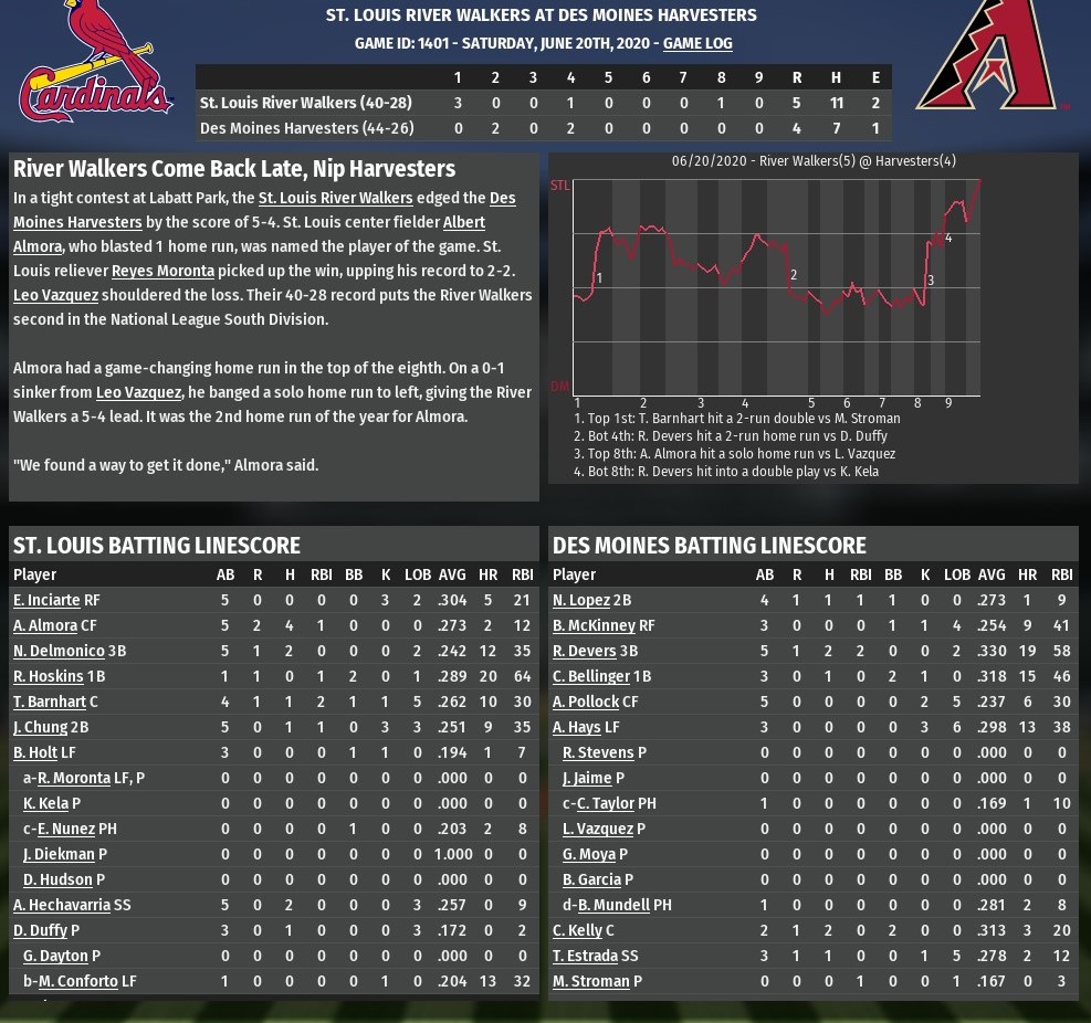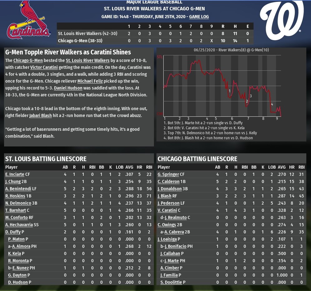 Acquired from St. Louis in the offseason, outfielder Jabari Blash made the River Walkers pay with a pair of home run including a two-run shot off Daniel Hudson in the bottom of the eighth inning that helped give Chicago an 10-8 win at Wrigley Field (1979). Blash's first homer had come in the third inning, a solo blast off St. Louis starter Danny Duffy which made it 5-3. Josh Donaldson had preceded Blash's at-bat with a two-run homer. In the trade where Chicago landed Blash, along with third base prospect J.D. Davis, it had sent Duffy to the River Walkers. St. Louis watched a 5-0 evaporate as Duffy had all kinds of problems. He could not get out of the fifth inning, having allowed six runs on nine hits in 4.2 innings. Chicago led 6-5 when he departed. A Victor Caratini two-run single off Keone Kela with two outs in the sixth later put the G-Men ahead 8-6 after the Walkers had tied it. Nicky Delmonico's two-run homer off Joe Kelly in the top of the seventh, tied it again. But that only lasted until the bottom of the eighth, when Blash took Hudson deep. A tiring Michael Feliz issued St. Louis a pair of walks in the top of the ninth, but didn't allow anyone to score as he earned his fifth win of the season. Chicago needed eight pitchers to get through the game. St. Louis sent six hurlers out to the mound. |