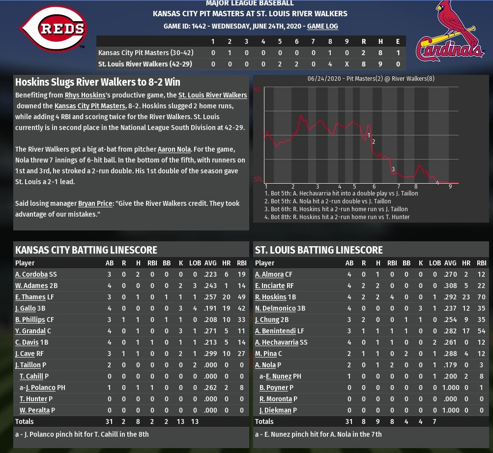 Aaron Nola allowed one run over seven innings and Rhys Hoskins homered twice to power St. Louis to an 8-2 win over Kansas City at Busch Stadium, With the win, the River Walkers swept the two-game series with the Pit Masters. Down 1-0, St. Louis grabbed the lead in the bottom of the fifth inning and Nola did the job himself with a two-run double off Masters starting pitcher Jameson Taillon. That lead grew to 4-1 an inning later, when Hoskins hoisted the first of his two long balls in the game with a two-run shot off Taillon. Hoskins second homer came two innings later, driving in the first two runs of a four-run bottom of the eighth. Doubles from Andrew Benintendi and Adeiny Hechavaria plated the inning's other two runs. Outside a single run in the second inning, Nola impressed allowing six hits while striking out nine and walking none. Last edited by rink23; 03-01-2019 at 04:44 AM. |