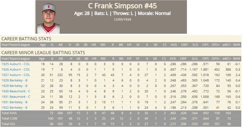 FRANK SIMPSON In real life Joe DiMaggio's 56 game hitting streak is one of those special records in baseball, and one that may never be broken. FABL has it's great hitting streak as well but it sits at 47 games and has stood for three and a half decades since Rich Rowley of Toronto hit safely in 1900. A couple of years back Philadelphia Keystones outfielder Lee Smith challenged Rowley's mark, but ultimately fell 3 games short. In FABL it is only in the minor leagues that DiMaggio's streak was surpassed and that was by a 31 year old journeyman named Ollie Miller, who had a 57 game streak in 1908 while playing for Evansville of the Class A Heartland League. 31 at the time, Miller's big league career had already ended with him playing just 141 games over two seasons for Washington and Toronto, batting just .231 for his big league career. The previous Heartland League standard was also quite impressive but lasted just one season as Al Eide of Lincoln had a 54 game streak. Eide was 27 at the time and would make his FABL debut the following season with the New York Stars. The Garden View, Pennsylvania native would end up playing 1,334 games in the big leagues with the Stars and Washington, finishing with a .281 career batting average. But while those streaks are certainly impressive, in this write-up I want to talk about a player who, despite having just 76 professional base hits and none in the major leagues, owns one of the most impressive hitting streaks in baseball history. Perhaps the greatest accomplishment in college baseball was Frank Simpson's 53 game hitting streak that spanned the 1926 and 1927 AIAA seasons. His is one of just 5 streaks in organized baseball to surpass the half century mark and is the only one achieved after the end of the so-called Dead Ball Era. Prior to Simpson run at Opelika State the AIAA record for consecutive games with at least one hit was 43, established by Bob Garrett of Lubbock State in 1915. Code: