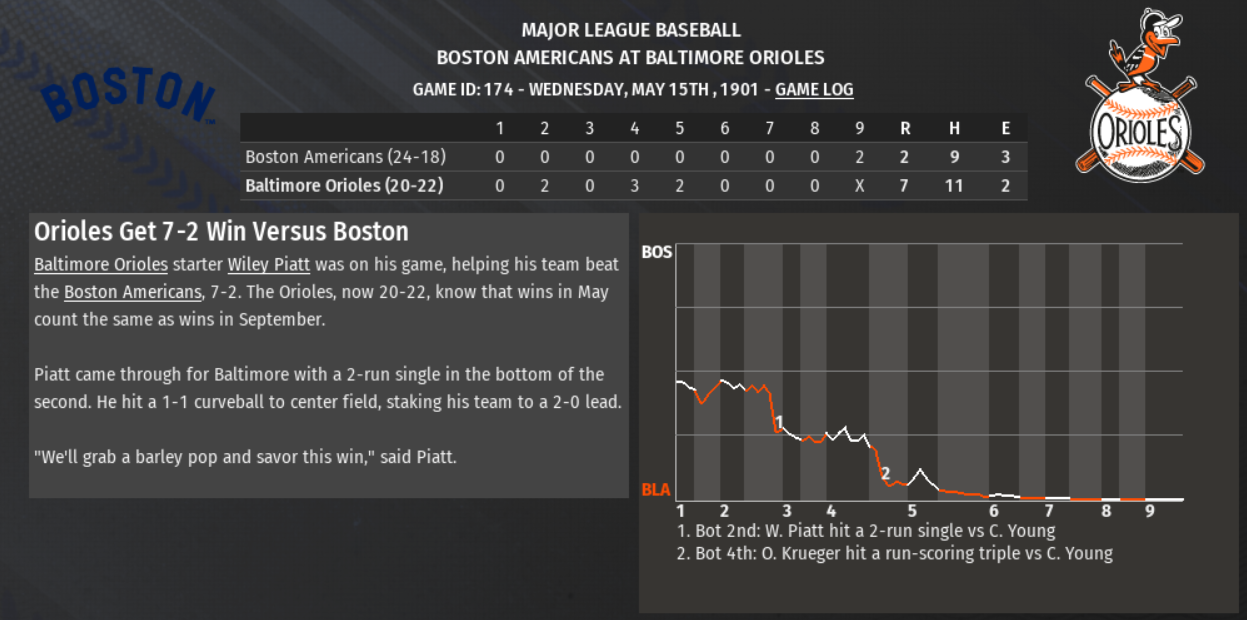 Game 42: The Baltimore Orioles (20-22) ran away with this one, jumping out to a quick lead and cruising to a 7 to 2 victory over the visiting Boston Americans (24-18). Not only did Baltimore pitcher Wiley Piatt (4-5) keep opposing batters in check (allowing just 2 earned runs on 9 hits, while striking out 5 and finishing with a Game Score of 66), he smashed the ball at the plate (2 for 4, 3 RBIs). Taking the loss for the Americans was Cy Young (4-5), who allowed 7 runs (3 earned) on 11 hits (5 extra base) and 1 walk to finish with a Game Score of 40. In addition to Piatt's efforts, the Baltimore hit-attack was helped by Otto Krueger (2 for 4, 2 Runs, 2 RBIs, and 1 Walk) and Roy Thomas (2 for 4, Double). Boston's limited hitting success was provided by Ossee Schreckengost (3 for 4, 1 Run, 1 RBI, Triple) and John Farrell (2 for 4, 1 Run, Double). Player of the Game: Wiley Piatt Game 43: Just what the team needed, a dominate pitching performance by Noodles Hahn to guide Boston (25-18) to a 2 to 0 win over the Orioles (20-23). In picking up the win, Hahn (8-4) tossed a complete game shutout, allowing just 5 hits, 1 walk, and 10 strikeouts to finish with a Game Score of 86. While Ed Doheny (2-3) was tagged with the loss, he pitched very well allowing 2 runs (0 earned) giving up 9 hits and 2 walks and ended with a Game Score of 66. It was the bottom of the Boston lineup that provided the offensive firepower, with the John Farrell (batting 7th, 2 for 4, Double), Pat Crisham (batting 8th, 2 for 4, 2 RBI, Double), and Noodles Hahn (batting 9th, 2 for 3). Player of the Game: Noodles Hahn (Season: #8 / Career: #8) Game 44: After 2 consecutive disappointing outings, the pressure was on Boston pitcher Jesse Tannehill to turn things around. Tannehill (7-4) rose to the occasion, allowing just 1 earned run (Game Score of 68) to lead Boston (26-18) to a 3 to 1 victory over Baltimore (20-24). Ted Lewis (3-6) was saddled with the loss, allowing 3 runs (all earned) on 8 hits and 2 walks (Game Score of 62). Boston centerfielder Bill Lange was the catalyst for the team's offense today, going 2 for 4 with 1 Run, 1 RBI, and Double. Player of the Game: Jesse Tannehill (Season: #8 / Career: #8)