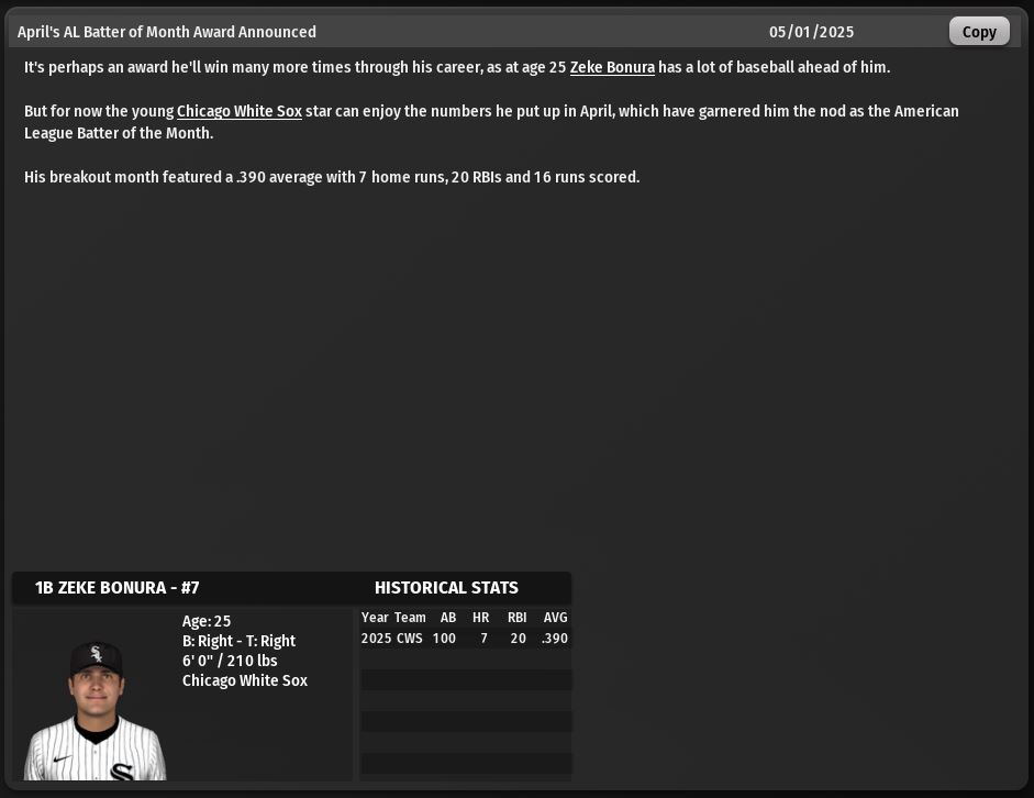 SP Early Wynn pitched a 6 h 4 k 3 bb CG SH. Charlotte Sp Gary Peters pitched a 5 h 4 k CG SH. 1b Zeke Bonura is named AL BOTM & ROTM for April.