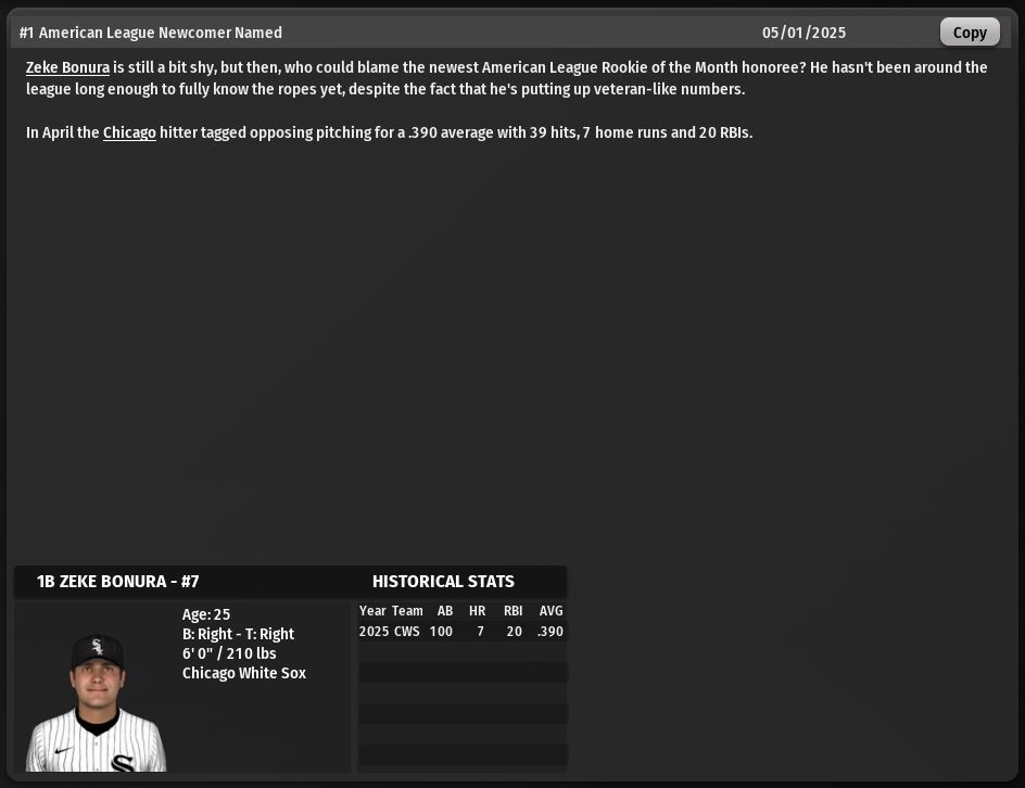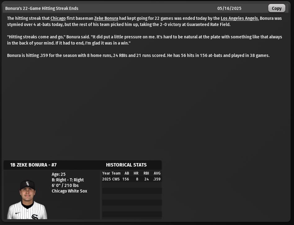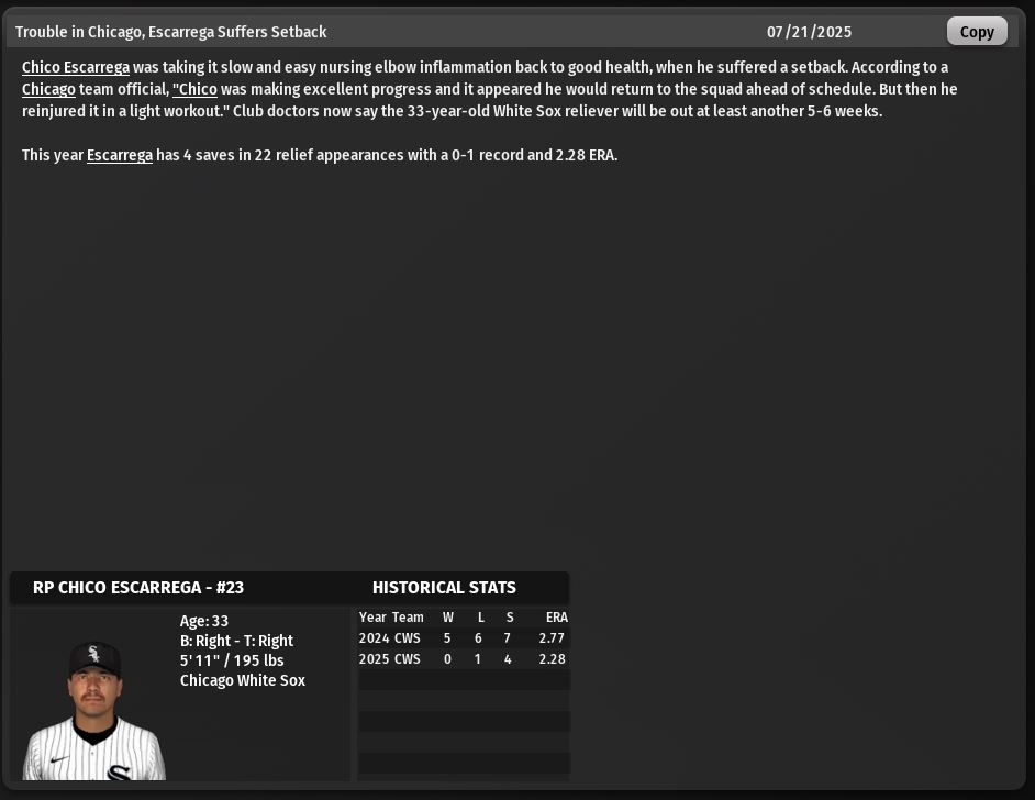 Offense has sputtered this season. Belle, Thome, Frazier have all struggled. Bonura, Valentin, Hernandez & Robinson have all looked good. Rotation other then Kaat have been ok. Pen looks good but not great. Radinsky & Pall have been good additions but Pall, Wilhelm & Ackley have struggled.