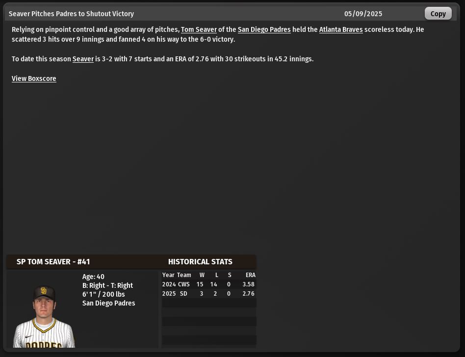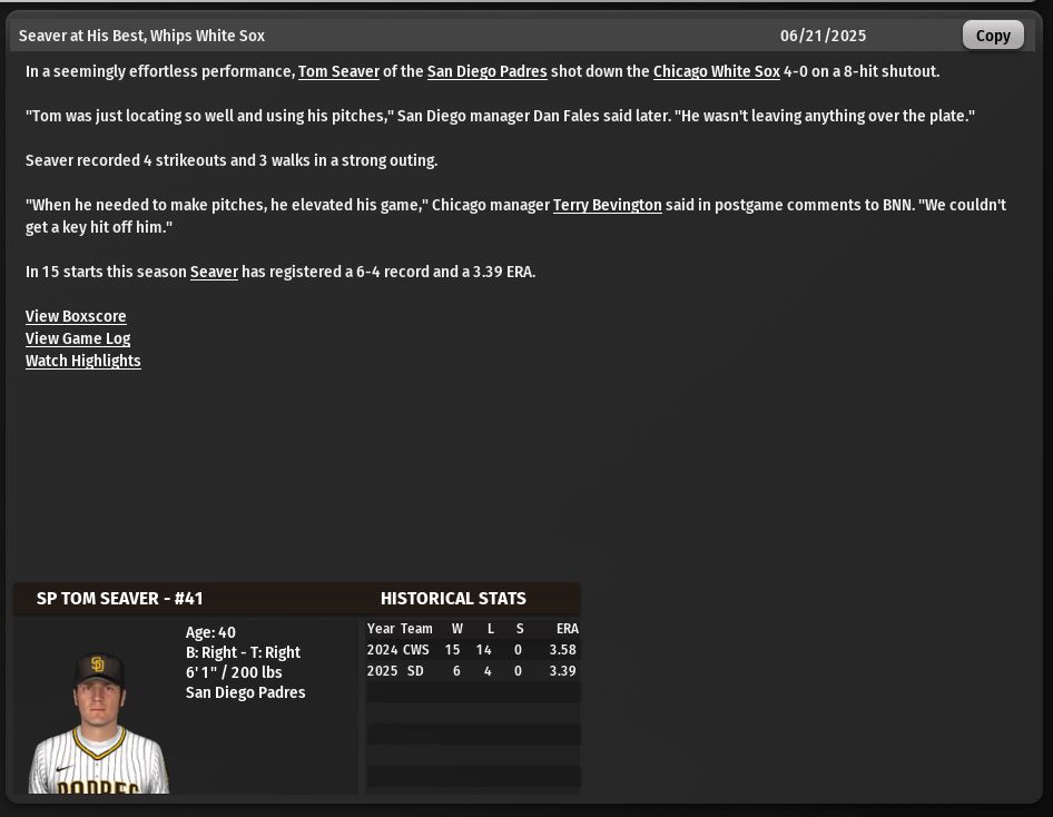 Padres SP Tom Seaver pitched a 6 h 8 k bb CG SH. He has 299 Wins.