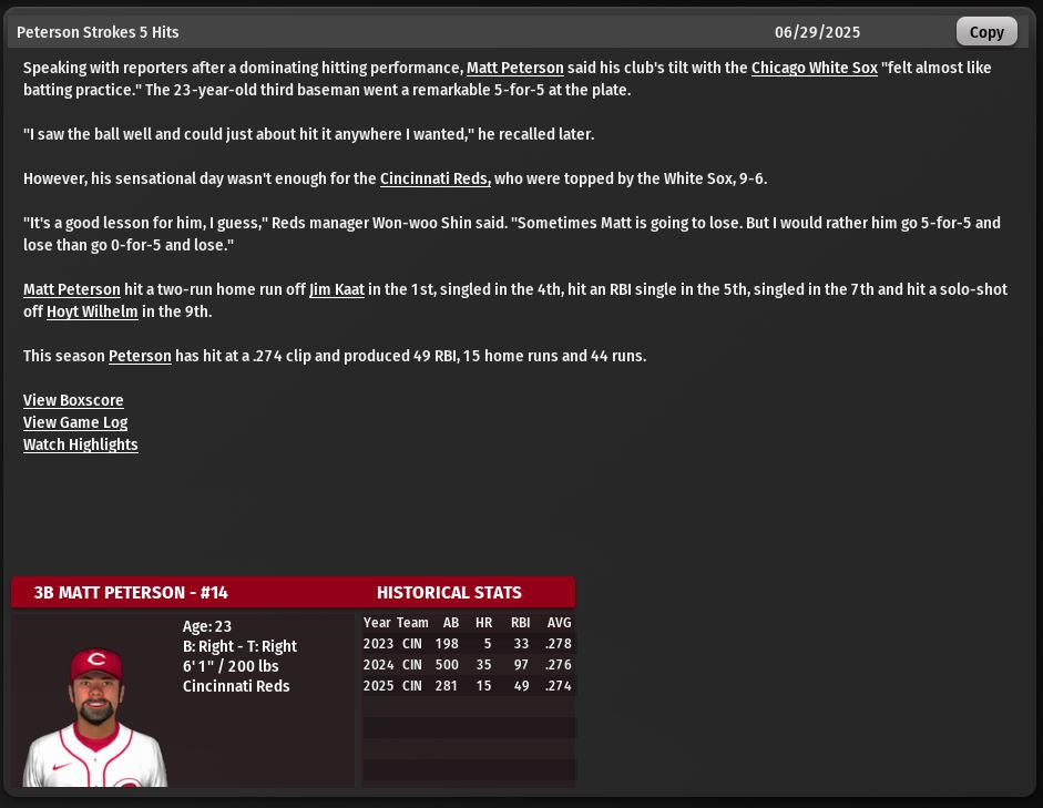 Reds 2b Matt Peterson has a 5 Hit game vs CWS.