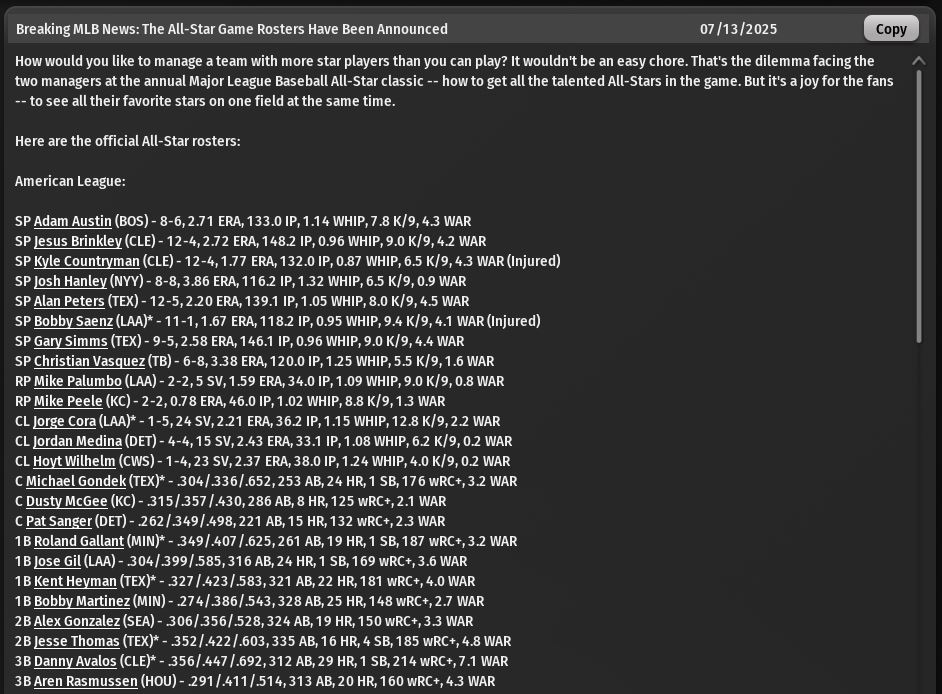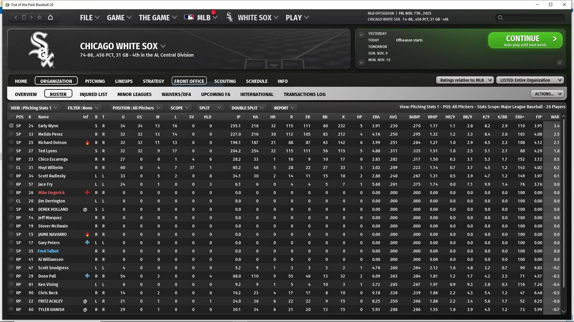 Terrible performance after making the playoffs last season. Albert Belle exercised his option. Hopefully several players who did poorly can rebound. While we go through some changes this off-season, most changes will be minor. Valentin led the offense in WAR. Wynn led the Pitching in WAR. Very few new players will join us in 2026. a CF and 2-3 bullpen arms.