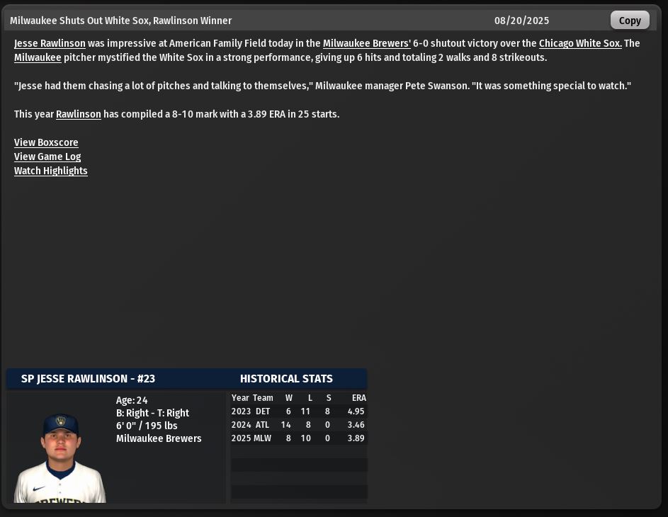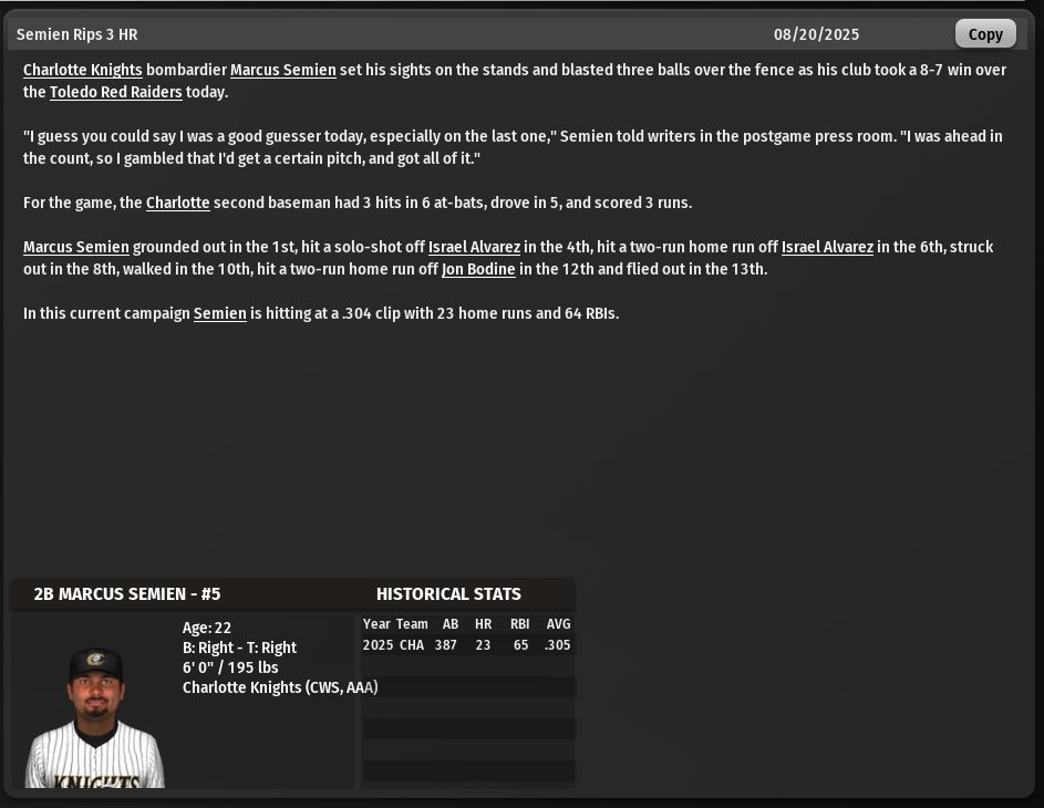 Charlotte 2b Marcus Semien has a 3 HR game. Brewers Sp Jesse Rawlinson pitched a 6 h 8 2 bb CG SG vs CWS. SP Early Wynn pitched a 3 h 5 k 4 bb CG SH. Dodgers SP Huirangi Yani pitched a 2 h 8 k bb CG SH vs CWS.
