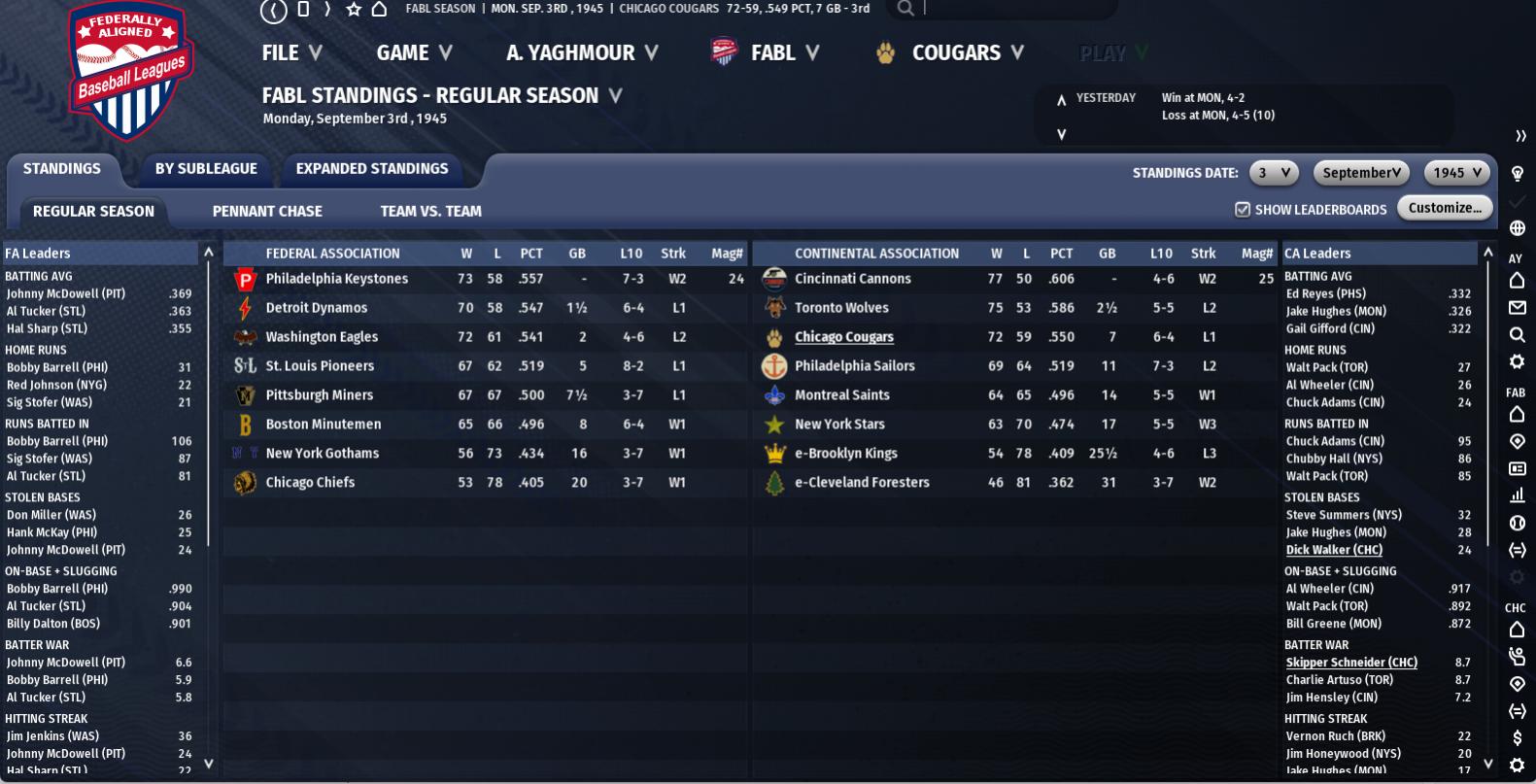 Seasonal Record: 78-69 (3rd, 13 GB) Stars of the Week None Generated Schedule 9-10: Loss at Foresters (3-7) 9-11: Loss at Foresters (2-3) 9-12: Win at Wolves (4-1) 9-13: Loss at Wolves (1-4) 9-14: Win at Wolves (8-7) 9-15: Win at Cannons (5-4) 9-16: Loss at Cannons (1-8) 9-16: Loss at Cannons (0-3) Recap And with another 3-5 week, the Chicago Cougars have been officially eliminated from postseason contention. What makes it even worse is we're barely holding on to third place, just half a game above the Sailors. We've secured a .500 or better record for the ninth consecutive season, but we're at risk of snapping our six season streak of finishing in the top three spots. Dropping both games in Cleveland was pathetic, and of course, we beat the Wolves (2) more then the Cannons (1). That helped the Cannons maintain their 3.5 game lead, as both teams finished the week an impressive 6-2. We have just four games this week and three the following week, so the boys will get plenty of rest to finish off the season. I still want to win every game left; there is both pride and a stronger draft spot at stake, so don't expect backups to flood the lineup. This week will be all about Dick Lyons, who will make his 563rd appearance and final appearance as a Chicago Cougar on the 23rd in our final home game of the season. We'll have a nice big number retirement ceremony for the beloved southpaw who is the only remaining player from the pre-human era to stay with the same organization they started with. In a season with not much to celebrate, this will be our World Series, and I hope we can win him one last game. His 237 wins are second most in Cougar history (crazy enough Harry Parker is 5th with 114), and despite not looking himself this year, he's been a dependable starter for 18 seasons. It will feel weird without him next season, but he'll be officially passing the torch to the youngsters Duke Bybee and George Oddo, and he'll have veteran Mike Taylor, his teammate for the last 13 and a half seasons catch him. Their combined 84 years and 227 days will be tough to top, and their combined leadership has helped us consistently win more then we lose. In the 13 full seasons they were teammates, we had just two (1935, 1936) losing seasons, equal to the amount of 97 win (1933, 1941) seasons during their tenure. Tough week all around, but George Oddo's likely final start of the season went pretty well. The 10 hits in 7 innings wasn't great, but he allowed just 3 runs (2 earned) and 2 walks with 6 strikeouts against a potent Cannons offense. The 22-year-old made 17 starts for us this season, an even 7-7 with a 3.02 ERA (117 ERA+), 1.17 WHIP, 51 walks, and 71 strikeouts. These were excellent numbers for the talented rookie that Tom Weinstock believes will develop into an ace. With Papenfus, the Jones Brothers, Joe Brown, Harry Parker, and Joe Brown all in line for starts next season, there's no obvious spot for Oddo. There's also Duke Bybee, who may join Oddo in Milwaukee, as he's looked overmatched so far. It's just three starts, but his two this week were very bad. The Foresters piled on 9 hits, 6 runs, and 6 walks with just 3 strikeouts in 6.2 innings pitched. Against the Wolves he walked 6 more, leaving after 7 with 11 hits, 7 runs (6 earned), and 2 strikeouts. Despite his struggles, I can't get too mad at him, as he has just 2 starts above C ball before his debut, and he hasn't pitched in years. We have so much talent in the rotation that we can afford to take things slow with Duke, who's hopped back up a spot to 6th in the prospect rankings. Pete Papenfus made a pair of starts, beating the Wolves while being hit hard by the Cannons. He went all nine in Toronto, allowing just 7 hits, a run, and 4 walks with 6 strikeouts. He fell apart in Cincinnati, just 7.1 innings with 9 hits, 8 runs (7 earned), 5 walks, and 4 strikeouts. It was his first start this season with more walks then strikeouts, but he's still struck out (47) 20 more hitters then he's walked. Harry Parker made a pair of starts as well, including our only win against the Cannons. Parker went 7 with 7 hits, 3 runs (2 earned), 3 walks, and 3 strikeouts. It was his first decision in five starts, as he couldn't top the Foresters earlier in the week. We didn't give him much support, as he left with one out in the 7th after allowing 9 hits, a run, and 3 walks with 6 strikeouts. Parker's next (and likely last) start of the season will be #35, and he surpassed 250 innings (250.2) for the fifth time in six seasons. The last start went to Billy Riley, who went 7 with 6 hits, 2 runs (1 earned), 5 walks, and 3 strikeouts. Rusty Petrick was active out of the pen, making 4 appearances and throwing 6.2 innings. He got a win and save, charged with 6 hits, 4 runs, and 2 walks while striking out just one. Mike Thorpe made three appearances but recorded just five outs, tagged with a loss, 2 hits, and a run. With just seven more games and plenty of off days, I doubt we'll need the pen much more, but I haven't yet decided if we'll bring up a few extra arms for the last week. Guys like Charlie Kelsey, Bill Tuttle, and Angel Lopez deserve a shot, but there aren't many games left and they deserve to win a Century League pennant instead of just wasting away in our pen. The lineup will get Rich Langton back this week, but that means less time for Ray Struble, who was one of two effective hitters this week. Struble went 6-for-18 with a homer, 2 RBIs, 2 runs, 3 walks, and 2 steals. The other was the red hot Skipper Schneider, who was 10-for-29 with a double, 3 (!!) homers, 2 walks, 4 RBIs, and 6 runs. That doubled Skipper's homer total for the season, and he's just a tenth of a win away from his first 10 WAR season. 25 in October, Skipper is close to finishing his six big league season, and his .291/.351/.391 (113 OPS+) triple slash could end up the best in his young career. We could technically add a third player to the list of effectiveness, as George Sutterfield made the 