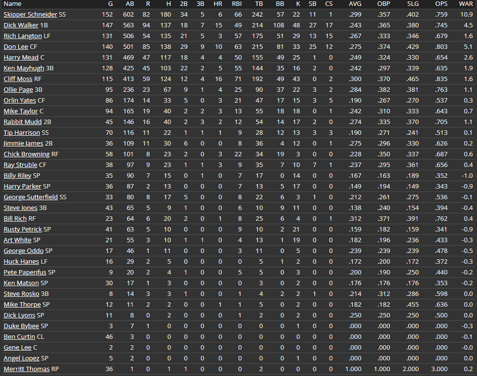 Solly Skidmore (CHI): 116 WRC+, HR, 8 RBI, 0.5 WAR Harry Mead (CHC): 94 OPS+, 4 HR, 50 RBI, SB, 2.6 WAR *Ben Richardson (MON): 76 WRC+, 4 HR, 34 RBI, 2 SB, 1.3 WAR Infielders Arnie Scurlock (WAS): 54 WRC+, 7 RBI, -0.2 WAR Billy Hunter (CHC): DNP - Military Service Tommy Wilson (STL): 89 WRC+, 3 HR, 44 RBI, 7 SB, 2.4 WAR Ducky Jordan (CHI): DNP - Military Service Hal Wood (TOR): DNP - Military Service Skipper Schneider (CHC): 119 WRC+, 6 HR, 66 RBI, 11 SB, 10.9 WAR Eddie Curtis (NYG): 80 WRC+, HR, 24 RBI, 4 SB, 0.5 WAR *Jimmie James (CHC): 75 WRC+, 8 RBI, 0.2 WAR *Ed Reyes (PHS): 143 WRC+, 7 HR, 73 RBI, SB, 3.1 WAR *Elmer Hutchins (CHI): 152 WRC+, 7 HR, 55 RBI, 2.6 WAR Outfielders Leo Mitchell (CHC): DNP - Military Service Reginald Westfall (TOR): DNP - Military Service Bunny Hufford (NYG): 120 WRC+, 5 HR, 45 RBI, 9 SB, 2.6 WAR Rich Langton (CHC): 100 WRC+, 3 HR, 57 RBI, 13 SB, 1.6 WAR Chink Stickels (NYS): 111 WRC+, 8 HR, 70 RBI, 16 SB, 5.6 WAR Carlos Montes (CHC): DNP - Military Service *Don Lee (CHC): 138 WRC+, 10 HR, 63 RBI, 25 SB, 5.1 WAR *Chick Browning (CHC): 114 WRC+, 3 HR, 22 RBI, 0.6 WAR Pitchers Danny Hern (STL): 14-17, 108 ERA+, 128 K, 6.1 WAR Dean Astle (BOS): 12-7, 120 ERA+, 59 K, 4.2 WAR Tom Barrell (CIN): 16-5, 110 ERA+, 53 K, 2.7 WAR Mike Murphy (DET): 1-6, SV, 67 ERA+, 4 K, 0.2 WAR Pete Papenfus (CHC): 3-4, 105 ERA+, 59 K, 1.4 WAR Harry Parker (CHC): 15-9, 127 ERA+, 130 K, 5.3 WAR Dick Lyons (CHC): 2-1, 98 ERA+, 3 K, 0.3 WAR Sam Hodge (NYG): 1-3, 3 SV, 116 ERA+, 14 K, 0.5 WAR Ben Curtin (CHC): 0-7, 18 SV, 85 ERA+, 17 K, -0.6 WAR Totals Hitters: 39.4 Pitchers: 20.1 Total: 59.5 Approximate Wins: 97 Notable Prospects/Picks Traded January 1945: Traded Danny Goff Jr. and Jim Dickinson to the Gothams for a 2nd Round Pick This Cougars team would have topped the Cannons by a mere two games, as we get to keep our most valuable hitter and pitcher and upgrade at almost every other spot. Last edited by ayaghmour2; 04-21-2023 at 12:57 PM. |