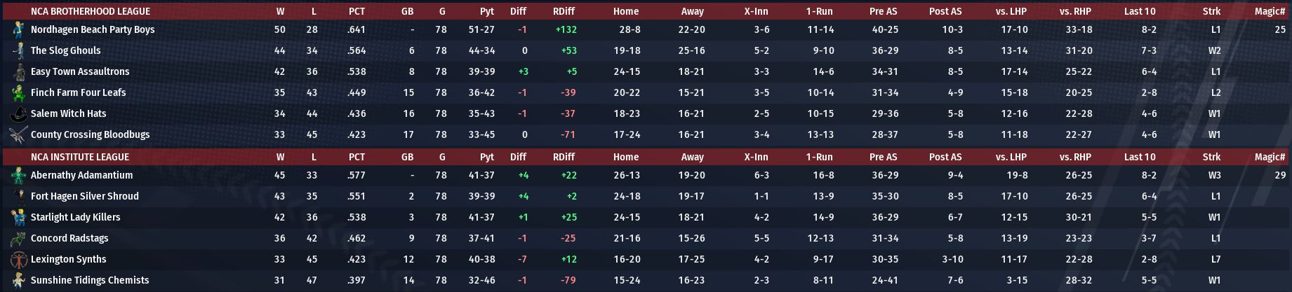 The top three remains intact with few big moves happening from week to week at this point in the season. With just 25 games remaining, some teams are on the verge of being out of playoff contention with Roxbury (24-59) appearing to be the first team on the way out. Oberland could clinch a playoff spot this week. The BL's The Slog and the IL's Abernathy have been the two hottest teams in their last 10 at 8-2, while Jamaica Plain on a seven-game losing streak is the coldest at 1-9. Realistically, we count 14 teams we think have a realistic shot of making the playoffs and 10 with no chance. We will mark those with 'PC' for playoff chance and 'NC' for no chance. Power Rankings Weekly Team Power Rankings: Here are the current team power rankings for Commonwealth Baseball Organization: Teams (Total Points, Tendency): 1) Oberland T-51s (132.1, o, PC) 2) Nordhagen Beach Party Boys (118.9, o, PC) 3) Goodneighbor Hancocks (118.4, o, PC) 4) The Slog Ghouls (113.1, +, PC) 5) Abernathy Adamantium (111.3, -, PC) 6) Warwick Mirelurks (111.1, o, PC) 7) Fort Hagen Silver Shroud (107.9, +, PC) 8) Quincy Gunners (102.6, ++, PC) 9) University Point Deathclaws (102.6, -, PC) 10) Diamond City Swatters (99.6, -, PC) 11) Easy Town Assaultrons (93.4, -, PC) 12) Concord Radstags (91.7, ++, PC) 13) Starlight Lady Killers (85.3, -, PC) 14) FHE Yao Guai (81.6, -, PC) 15) Egret Ninjas (81.2, +, NC) 16) Vault 81 Dwellers (81.1, -, NC) 17) Salem Witch Hats (78.1, -, NC) 18) Lexington Synths (70.9, ++, NC) 19) County Crossing Bloodbugs (69.7, -, NC) 20) Sunshine Tidings Chemists (69.6, o, NC) 21) Finch Farm Four Leafs (69.1, -, NC) 22) Jamaica Plain Red Rockets (56.6, -, NC) 23) Atom Cats (53.1, -, NC) 24) Roxbury Knuckle Punchers (53.0, o, NC) Standings and Team Statistics