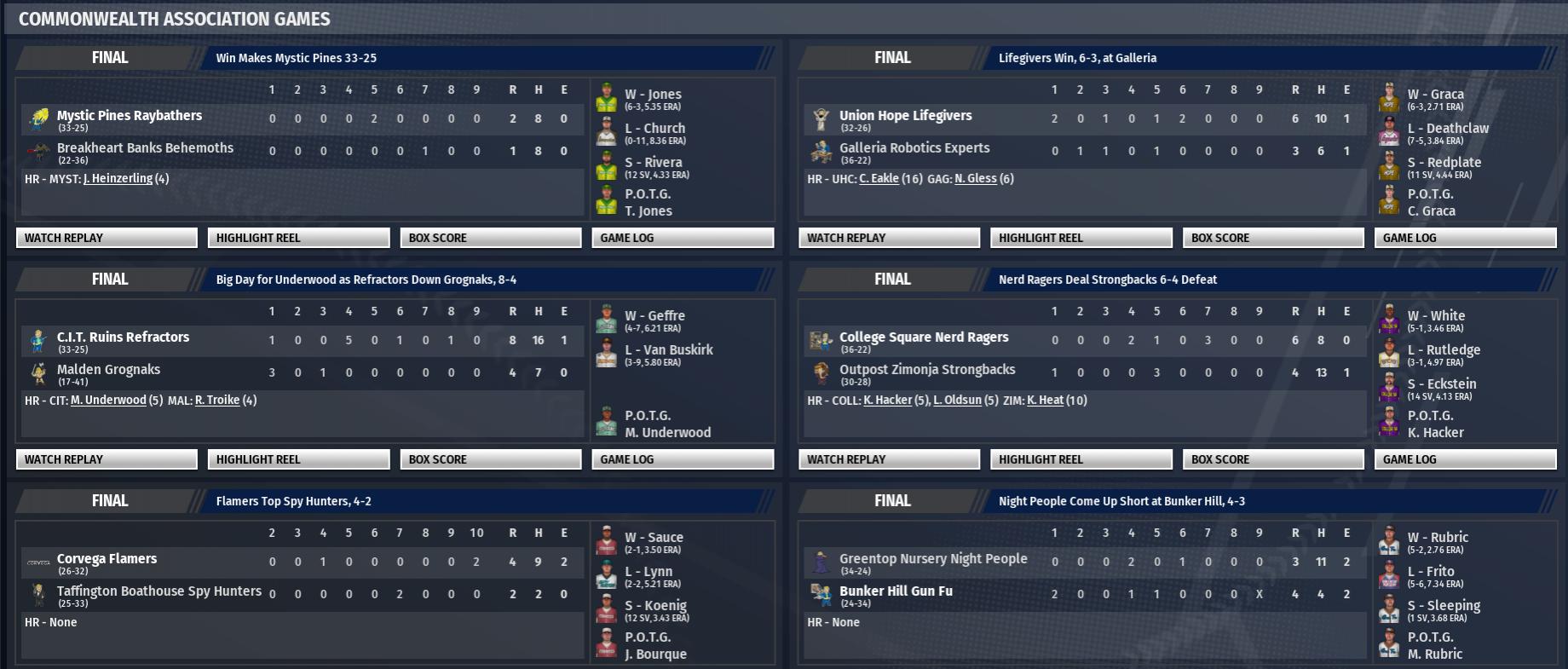 Today in the CBO News and Notes - Reports from around the Commonwealth by Nat Wright-Kawolski 24 July 2298 - BMU: College Square Closer Suspended Two Games by Team College Square rookie closer Muther Eckstein has been suspended by the team for two games following playing hookie from a weekend practice. Epstein returned to the team this morning with a handwritten excuse note in his handwriting that was signed "Eckstein's Mother." Nerd Ragers manager Jeremy Jenkins didn't buy it. "We have suspended Muther Eckstein for the next two games due to missing practice," Jenkins said. "We are on a 10-game winning streak and currently in first place. We want to keep working hard to maintain that position, so all of our players need to know that we expect 100% every single day. Missing practice is 0%, not 100%." Eckstein is 2-1 with 13 saves and a 4.28 ERA in 26 appearances. 24 July 2298 - Mirelurks RF Sanderson 4-5 in Win The Warwick Mirelurks topped the Jamaica Plain Red Rockets by a score of 11-6. Leading the way was right fielder Melon Sanderson. Sanderson was 4 for 5 with a home run, a double, and 2 singles, while scoring 2 times and driving in 5 for the Mirelurks. The triumph puts Warwick at 44-34 for the season. In the top of the third of a scoreless game, Sanderson hit a 3-run home run to put his team ahead. Sanderson said he was "thrilled" the fans had something to get excited about. 24 July 2298 - Shuster Lifts Knuckle Punchers to Win The Roxbury Knuckle Punchers went home winners at Atomatoys Stadium at Roxbury, thanks in large part to starter Tyler Shuster. Shuster stifled the Egret Ninjas, enabling Roxbury to grab the 6-1 win. The victory makes Roxbury 21-57. Shuster (4-6), who was born in Bourne, Massachusetts, threw 101 pitches over 9 innings, while allowing 1 run. He dropped his season ERA to 6.03. "It's a mindset," said Shuster. "Just trying to do your job, trying to be consistent." Rookie RF Young Goodman led the Punchers in batting, going for 3 for 5 with two runs and two RBI. 24 July 2298 - Deathclaws Squelch Hancocks Offense in Shutout Win, Sweep University Point Deathclaws pitcher Adam Froggatt was in fine form, leading his team past the Goodneighbor Hancocks, 5-0. The first-place Hancocks have dropped 4 straight games. In the top of the sixth, the Deathclaws found themselves in a jam. Goodneighbor had runners on 2nd and 3rd with two out. The score was 2-0, University Point. Jason Juras was at the plate, hoping to deal the Deathclaws a serious blow. Instead, he struck out to end the threat. 24 July 2298 - Chemists Spill Silver Shroud, 8-4, Win Series The Sunshine Tidings Chemists topped the Fort Hagen Silver Shroud, 8-4, in North Charles Association action at Hubris Comics Park. The game was highlighted by the performance of Sunshine Tidings first baseman Jalen Wharton. Sunshine Tidings pitcher Bill Sarnacki got the win, upping his record to 7-11. Joey Dimes got the loss. The Chemists go to 31-47 with the win. Who knows how it might've ended, had it not been for Frank Corsica? The Sunshine Tidings center fielder had a bases-clearing double in the top of the fifth inning to put the Chemists on top, 5-1. For the game, Corsica had 2 doubles and 1 single in 5 at-bats. "It feels good to get this one," Corsica told the Sunshine Tidings Bulletin. 24 July 2298 - Bloodbugs Shock Party Boys, 5-1, Claim Series Win Jeff Rickashaw was locked and loaded, helping the County Crossing Bloodbugs beat the Nordhagen Beach Party Boys, 5-1. The Bloodbugs saw their record improve to 33-45. In the bottom of the first, Josh Noggin hit a 3-run home run. The 20th home run of the season for the County Crossing first baseman put the Bloodbugs on top, 3-0. Noggin finished with four RBI. "Nice to see our side come away with the win," Noggin said after the game.