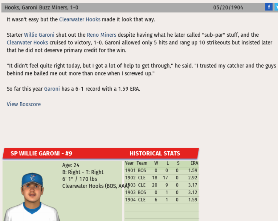 Clearwater Hooks pitcher Willie Garoni was dialed in tonight as he shutout the Reno Miners by a 1 to 0 score. Despite allowing 5 hits, 6 walks, and 2 wild pitches, Garoni (6-1) struck out 10 batters in his 140-pitch effort; Game Score 81. At 24-years of age, Garoni is looking to make the move to the Boston Americans rotation.