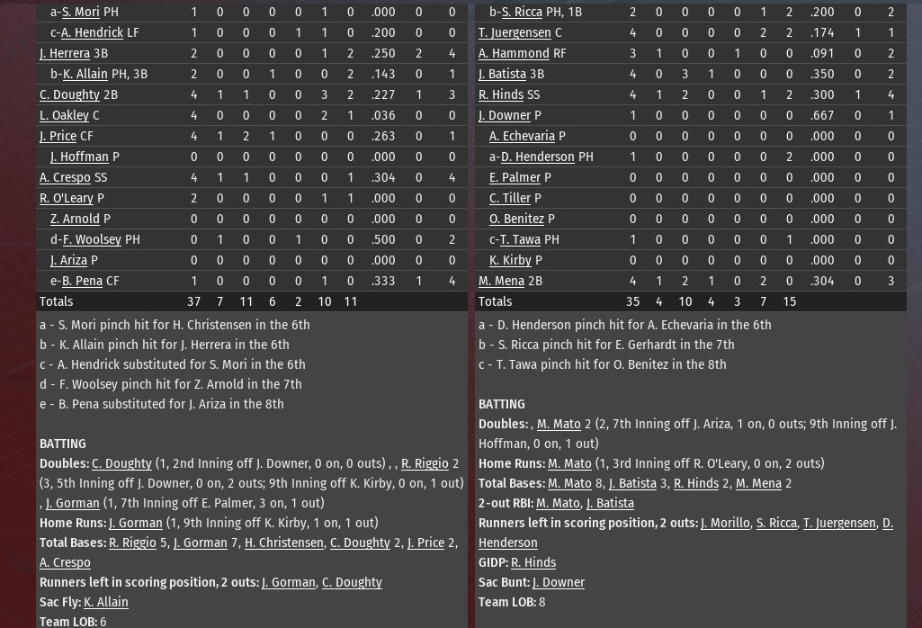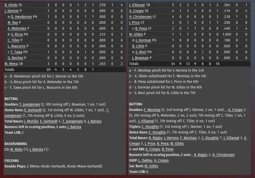 Notes Detroit advanced with a 3-1 win over Cleveland in the ALCS. Cedar Rapids advanced with a 3-1 win over Twin Cities in the ALCS Cedar Rapids won the season series 3-1 June 21 -- at Detroit Cedar Rapids 3, Detroit 1 W - J. Goshe (2-1). L - N. Wilson (2-1). Sv. - K. Kirby 12. HR - none. June 22 -- at Detroit Cedar Rapids 6, Detroit 4 W - L. Mascorro (2-1). L - N. Quito (1-3). Sv. - K. Kirby 13. HR - none. June 23 -- at Detroit Detroit 9, Cedar Rapids 7 W - J. Ariza (3-2). L - A. Echevaria (4-1). Sv. - P. Maldonaldo 4. HR - CR: S. Williams 5, R. Hinds 5, J. Miller 3, J. Batista 12. Det: F. Woolsey 2. June 24 -- at Detroit Cedar Rapids 5, Detroit 2 W - J. Glenn (8-5). L - W. Gibbs (4-4). Sv. - O. Benitez (1). HR - CR: D. Henderson 13, R. Hinds 6. Postseason history Cedar Rapids has made the playoffs twice (2021 and 2035). This is the Grapplers first World Series. Detroit has made the playoffs three times (2024, 2026 and 2035). The Diesels won the World Series (2024 and 2026). |