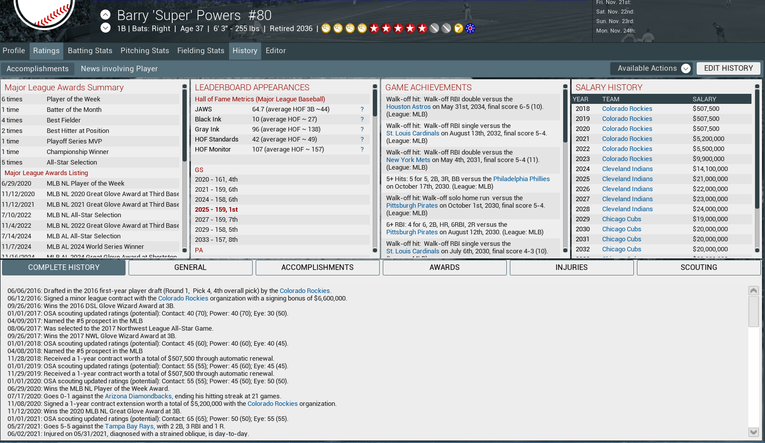 Barry retires with 2714 hits, 227 HR, 1089 RBI, 1297 runs, and a 78.9 WAR. Barry ranks 69th in hits and 47th in WAR, just behind Jeter at 79.16. Barry was a 5 time allstar, 4 time gold glover, Playoff MVP, and a championship winner. |
