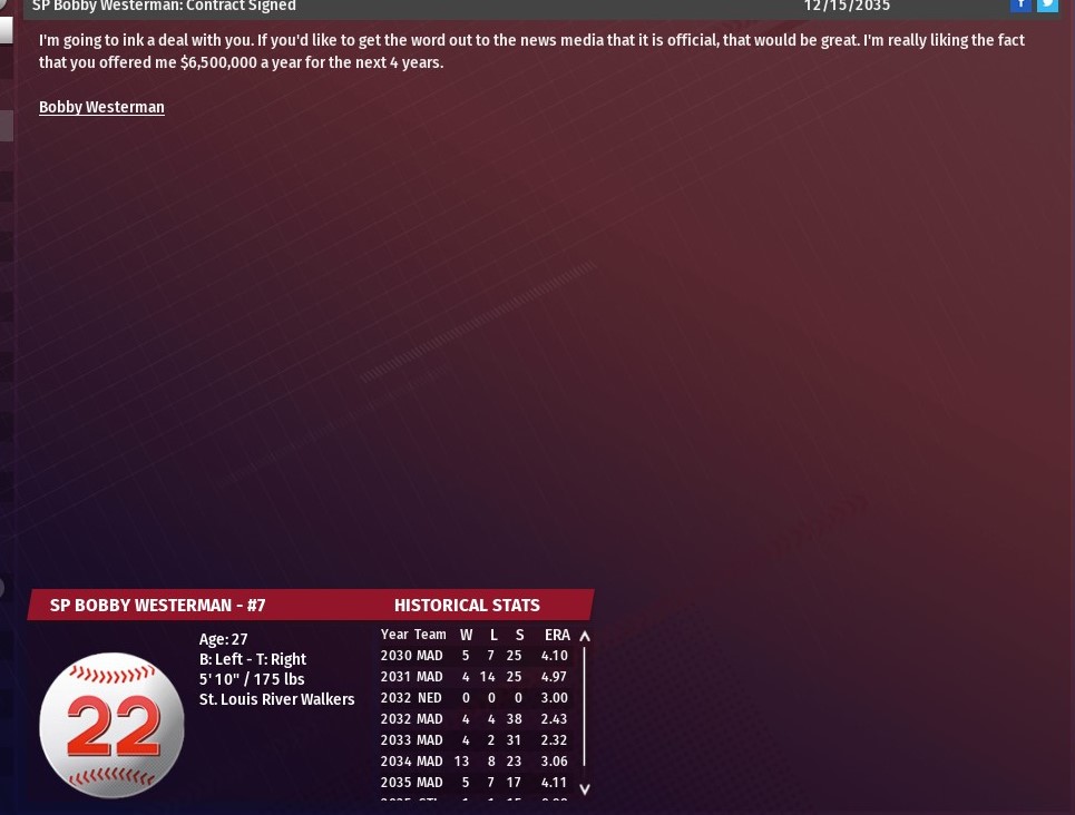 The St. Louis River Walkers have announced that free-agent closer Bobby Westerman has decided to remain with the team.