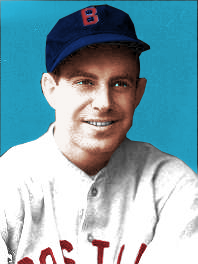 Rick Ferrell colorized by request with the Boston Red Sox. Image is presented with original white B with red B and red uniform letters. . with colorized blue background and background removed and replaced with solid background.