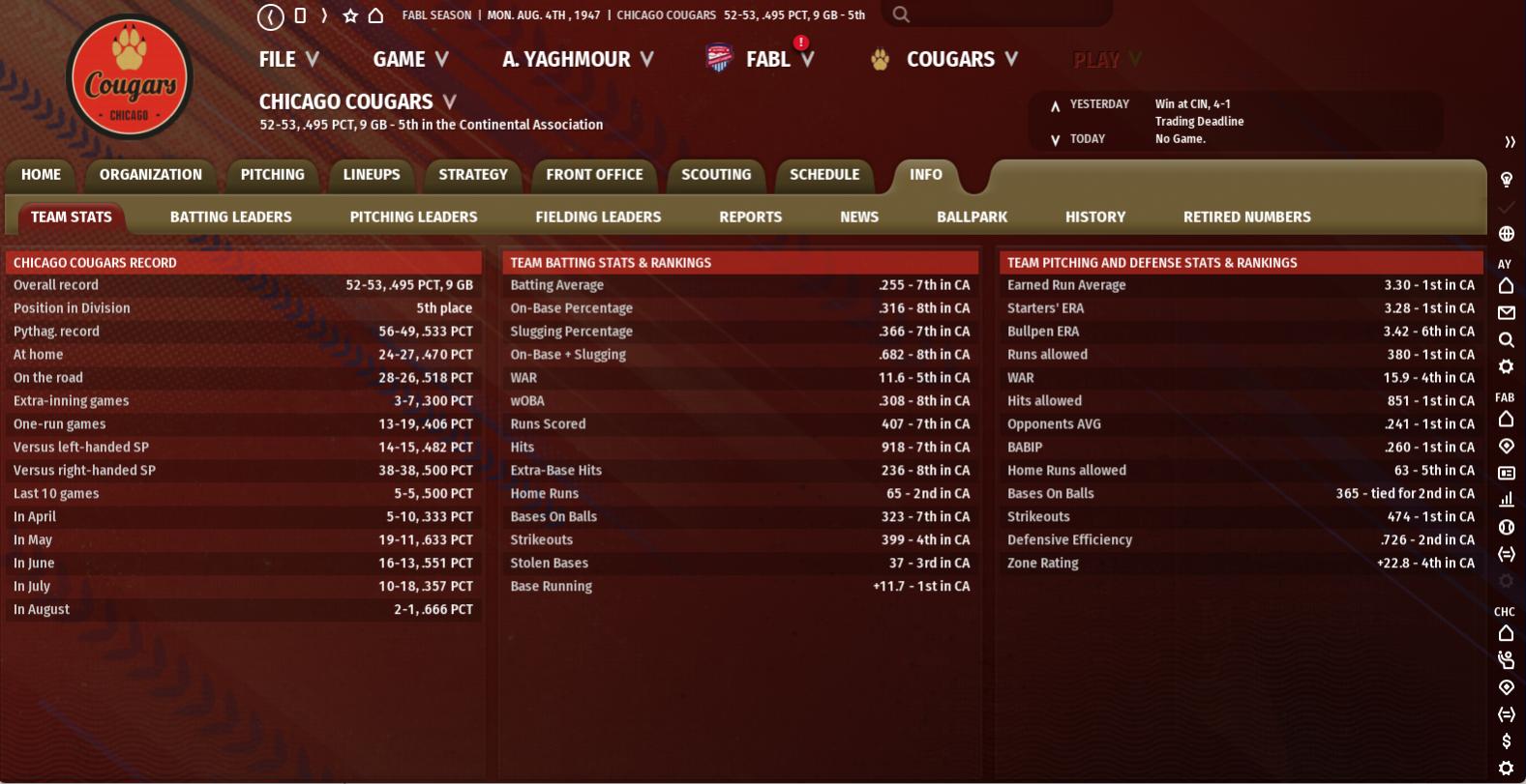 AAA Milwaukee Blues (Century League): 70-70, 5th, 22 GB: After winning four consecutive Century League titles, the Milwaukee Blues had a miserable season in 1947. Like the Cougars, they had a long stretch of over .500 seasons, but unlike us, they at least finished even at 70-70. They did that in 1937 as well, with their last sub .500 season coming all the way back in 1929 when they finished 68-72 and in 5th place. The Blues actually finished the season well, as after a 14-23 start, they finished above .500 in each of the last four months of the season.