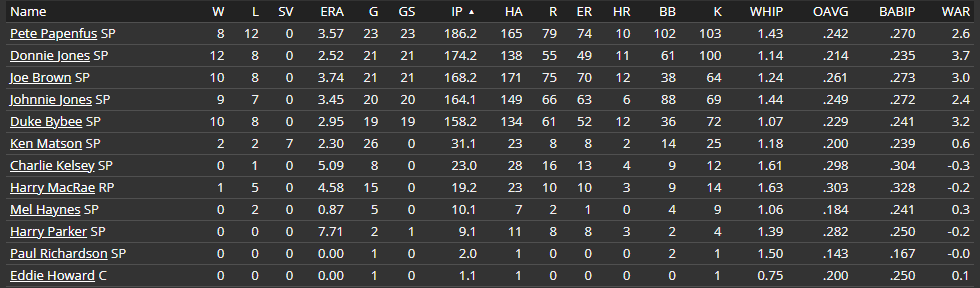 Acquired: Via Draft: 3rd Round, 45th Overall (1947) Alma Mater: Union City Bulldogs Checking in two spots below 5th Rounder Buddy Jenkins is 3rd Rounder Dudley Sapp, who was originally in the top 100 but found his way on the outside this offseason. Part of that could be accounted for the fractured thumb that ended his season in early August, limiting him to just 29 games in his draft season. He also really cooled off after an excellent start, batting just .271/.322/.346 (87 OPS+) in 118 trips to the plate. Now 19, all those came when he was 18, and while the overall numbers weren't great, it's something to build on. The main concern is the power, as Sapp is known for his slug and he hit just two homers and no doubles. He does have a very strong hit tool, but if he wants to make it to the big leagues, he's going to have to tap into his above average power. He's a strong 6'4'' slugger who should be able to hit 25+ homers in the big leagues, and the mix of contact and eye should allow him to reach base frequently. OSA loves him at first, so perhaps that means he could fill in at a corner outfield spot, but I'm not sure he has the speed to cover much ground. Everything relies on the power potential, as if he hits it he could spend a decade manning first in a Cougar uniform. If not? He'll be lucky to get the call from AAA. There's plenty of risk, but it's hard to pass up a guy who can hit the ball as hard as he does. RF Jimmy Hairston (129th Overall) Acquired: Via Draft: 4th Round, 61st Overall (1943) Alma Mater: Bowman Mohawks It was a big season for Jimmy Hairston, who spent most of his season as a 22-year-old in AA. 120 of his 137 appearances came with the Commodores, where he hit an impressive .318/.386/.441 (113 OPS+) with 32 doubles, 4 triples, 6 homers, and 63 RBIs. He also drew 55 walks and produced a 121 WRC+ while playing decent defense out in right (6.4, 1.005). A former 4th Rounder back in 1943, Hairston is now Rule-5 eligible, and I've just given him our 36th 40-man roster spot that was vacated with Dick Walker's retirement. I'd love for him to get an extra look in the Cuban Winter League, as the extra development can really do him wonders. As a corner outfielder, he's going to need to hit, and he does have the bat to keep his average above .300 for a full season. He won't hit many homers, but as demonstrated by his time in Mobile he'll make up for it with plenty of doubles. He has a good eye and can draw a walk, but he still chases a bit too often. If he can hit just about average power, maybe 10-15 home runs a season, he could live up to Dixie's projection to "unleash obvious talent both on the field and at the plate" while OSA thinks he has "the talent to flourish as a right fielder." These are glowing reviews for the young righty, but I think he's going to need a few more seasons before even sniffing that. If all breaks right, he could be a useful every day player, but our outfield picture is crowded and won't loosen up any time soon. RHP George Carter (177th Overall) Acquired: Via Draft: 9th Round, 141st Overall (1947) Alma Mater: Bluegrass State Mustangs A ninth round pick out of Bluegrass State, it's a bit shocking to see righty George Carter ranked so high on the prospect list. He struggled in the rotation down in La Crosse and actually finished the season in the pen. He started just 3 of his 9 appearances and had a 5.06 ERA (74 ERA+) and 1.91 WHIP in 26.2 innings. The underlying metrics are much stronger, as he had a tremendous 4.3 K/BB (30-to-7) and 2.37 FIP (63 FIP-) in the small sample. A four pitch pitcher, he does have the stuff to start, and I'm hoping he can enter the San Jose rotation to start next season. He did have a red arrow and since we had plenty of pitchers in the low minors, there wasn't really a spot for him there. The Maywood, Illinois native is also a bit of a soft-tosser, as his fastball sits in the mid 80s and he's been susceptible to the flyball. No homers allowed, but he's a flyball pitcher who's not going to blow people away with his stuff. I'd like to see more from his sinker, which doesn't generate the groundballs it should. Carter may be one of those "misses" on the prospect list, but the command has been special, and if he can sit in the 3-4 range with his K/BB we can live with all the other problems he may run into. C Mike Bordes (181st Overall) Acquired: Via Trade with Washington (1946) Drafted: 11th Round, 169th Overall (1944) Alma Mater: Newburgh Knights Our highest ranked prospect not to be drafted by us, Mike Bordes was part of the offseason trade last year that sent Billy Riley to the Eagles. Bordes spent 1946 with their AA team, but the results weren't great, and I wanted the 21-year-old in A ball to start. He spent most of his season there, hitting .250/.323/.423 (98 OPS+) with 23 doubles, 5 triples, 10 homers, and 67 RBIs. His WRC+ (102) was a bit better then his OPS+, and if you average them together he was basically a league average hitter while walking (40) one more time then he struck out (39). When we moved Homer Guthrie up to Chicago for the final month of the season, that moved Bordes up to Mobile, but it did not go well. He did still walk (9) more then he struck out (7), but his triple slash dropped to .211/.294/.263 (45 OPS+) in 87 trips to the plate. Bordes is now in a tough spot, as I expect Guthrie or Eddie Howard to end up in Milwaukee, and I want 13th Rounder Bob Mundy playing everyday as well. This could mean Bordes will have to start the season back in A ball, as that trio all have green arrows up to Chicago. Bordes has a lot more upside then Guthrie and Mundy, boasting a nice hit tool and a good feel of the zone, but since he's not the greatest defender, him and Mundy could split time between catcher and first. I'm not sure he has the power to last at first, but if he cost too many runs catching most days, he could be a useful C/1B piece off the bench. LHP Mike Emerson (185th Overall) Acquired: Via Draft: 4th Round,