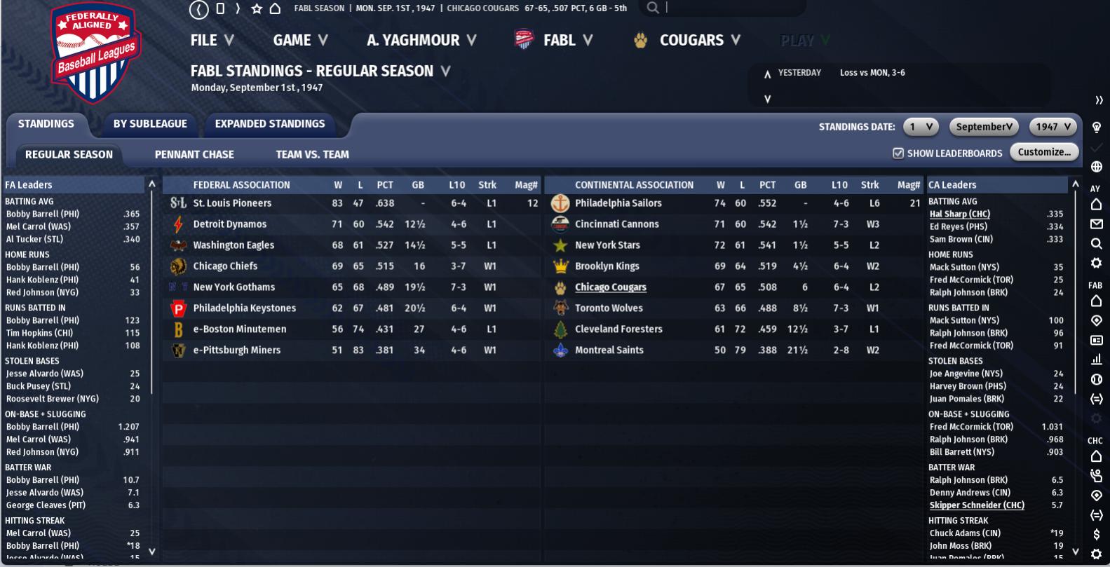 Seasonal Record: 70-80 (7th, 14 GB) Stars of the Week Hal Sharp : 10 AB, 5 H, 1 HR, 2 RBI, .500 AVG, 1.300 OPS Skipper Schneider : 13 AB, 6 H, 0 HR, 0 RBI, .462 AVG, .923 OPS Walt Pack : 11 AB, 4 H, 1 HR, 4 RBI, .364 AVG, 1.000 OPS Schedule 9-16: Loss at Foresters (7-11) 9-17: Loss at Sailors (1-5) 9-18: Win at Sailors (5-2) 9-20: Win vs Kings (2-3) 9-21: Loss vs Kings (8-3) Recap Two whole wins? Wow! That tripled our win total for the month! Of course, that also means we lost three games, and have now reached the 80 loss mark for the season. We had a few milestones that are worth mentioning, starting with Leo Mitchell's 2,000th career hit. Our struggling slugger recorded that magical hit in the 4th inning of our 8-3 loss against the Kings in Chicago, a single off veteran righty Buddy Long. Mitchell later scored and recorded a second single later in the game. It's a small consolation for Mitchell, who despite hitting .330/.373/.445 (130 OPS+) in 1,563 career games is hitting just .269/.313/.385 (90 OPS+) in exactly 600 trips to the plate. Mitchell will not hit .300 for the first time, well, ever and there are plenty of new firsts he's setting this year. At least the popular veteran has something to be happy about, as 2,000 big league hits is a very impressive milestone, and he becomes the 4th Cougar to record 2,000 hits with the franchise. The second milestone is a first, with Otto Christian hitting the first of hopefully many home runs in what should be a prolific home run hitting career. The 24-year-old took Harry Carter deep in the first inning of our 3-2 win over the Kings, depositing an 0-2 screwball 431 feet to left field. That gave us the 3-0 lead that proved to be enough for Duke Bybee, who will finish his season 14-11 with a 2.91 ERA (132 ERA+) and 1.09 WHIP. Bybee was worth exactly 5 WAR in 228.2 innings, and he struck out 104 batters while walking just 63. Bybee has a legit shot at the Allen Award, ranking top five in the CA for ERA (4th), complete games (5th, 18), shutouts (1st, 6), K/BB (5th, 1.7), WHIP (1st), ERA+ (4th), rWAR (5th, 6.3), and opponents average (4th, .225). The rest of Otto's week wasn't so great, as he was just 2-for-11 with the second hit an RBI single that scored Mitchell after his milestone hit. With four games left, I expect two starts for Otto, who I'm hoping will platoon with Walt Pack next season. A few other notable notes... Well, I definitely shouldn't have started Mel Haynes, who got teed off of by the Foresters. He lasted just 6.1 innings, allowing 13 hits, 7 runs (6 earned), and 2 walks with just one strikeout. His ERA (2.62) is actually higher then his FIP (2.38) now, and the overall numbers still look solid. George Oddo's home run struggles continued, allowing two in seven innings during our 5-1 loss to the Sailors. He finished with 9 hits, 5 runs, 2 walks, and 5 strikeouts. Not great, but it was on the road against a very good team. He'll get one more start, going again on the 24th against the Saints in Chicago. Another guy getting a final start is Joe Brown, who will finish off the season in New York on the 25th. Brown has lost five straight decisions and hasn't won since the 15th of August, and I want him to get one last shot at ending the season on a high note. He allowed 7 hits, 7 runs (3 earned), and 2 walks with 2 strikeouts in just 5.2 innings. He only threw 87 pitches and could probably pitch on Tuesday if we needed him, but I'm really hoping he can lower his 3.98 ERA (97 ERA+). Brown hasn't had a below average ERA+ since 1940, which was also the first season he threw more then 50 innings. 34 next March, this start may be his last as a Cougar, as I need to upgrade our offense and he's one of the few pitchers I'd be willing to consider trading. While his age may work against him, his personality will benefit, as Captain's are very valuable in the clubhouse. I hope he has one last shutout in him, but the Stars are good and capable of hitting plenty out of the park. Donnie Jones' Allen candidacy is now official, ending his season with his 15th complete game victory. That includes four shutouts, which may make him the only other pitcher Duke Bybee won't have at least twice as many shutouts as. Like Bybee, Donnie ranks top five in many categories, including ERA (3rd, 2.89), innings (5th, 249.1), complete games (3rd, 21), strikeouts (2nd, 139), K/BB (4th, 1.7), WHIP (2nd, 1.16), ERA+ (3rd, 134), rWAR (1st, 7.1), opposing average (2nd, .222) and win percentage (3rd, .640). There's no clear favorite this season, so it'll be cool to see who people end up picking. Plenty of teams will want their guys to win and it would make sense for the hometown scribes to vote for their worthy candidates. I'm going Jones one, Bybee two, but I wouldn't blame anyone for not picking either. Our bats still have time to improve their final lines, but there's a few guys worth mentioning what they did for the last week. Dick Walker started both games in Philly, and their former star was 1-for-5 with a triple, 2 runs, and 3 walks. Despite an underwhelming .209/.352/.286 (76 OPS+) triple slash, Walker produced a 91 WRC+ with 6 doubles, 5 triples, 8 steals, and 16 RBIs in 257 trips to the plate. 44 walks have gotten him on base plenty of times, but he never really looked like himself this year. He may get a few bench appearances in the final week, but this will be his last week as a Cougar. He may decide to retire, but we won't have room for him, and at a projected $34,000 that's a very high price to pay for a backup first basemen. I hope he doesn't go to the GWL, but there's a chance an FABL team could add him for a boost in ticket sales. Looking Ahead Four more games left, two with the Saints (59-89) in Chicago, one with the Stars (79-72) on Thursday, and the finale in Brooklyn (81-70) to end the season. What's more interesting is the race to take on the St. Louis Pioneers (91-58), who pretty much curb stomped the Fed and went through a dominant worst to first campai