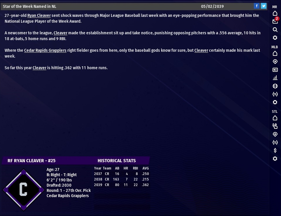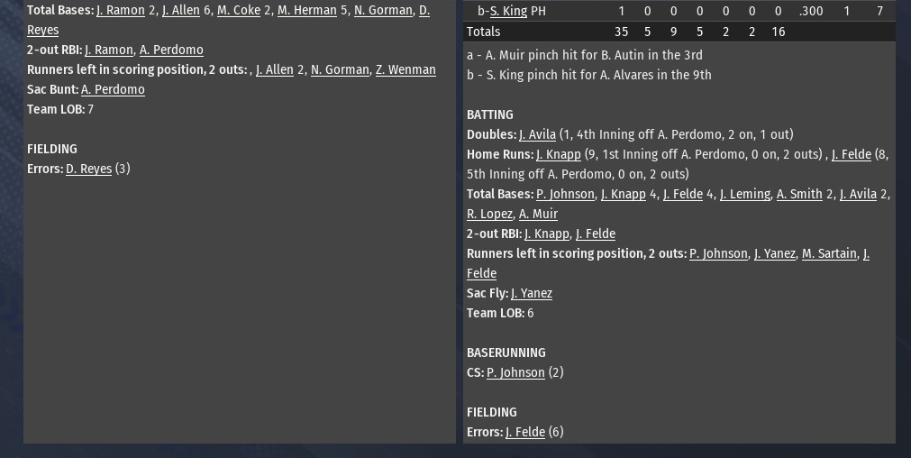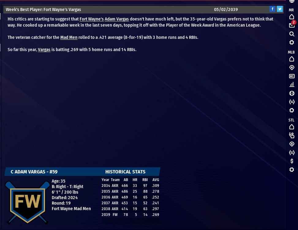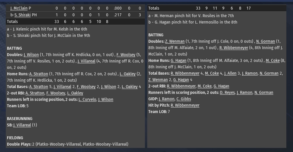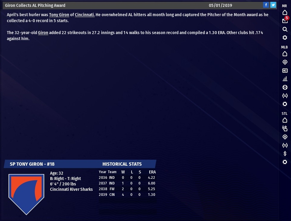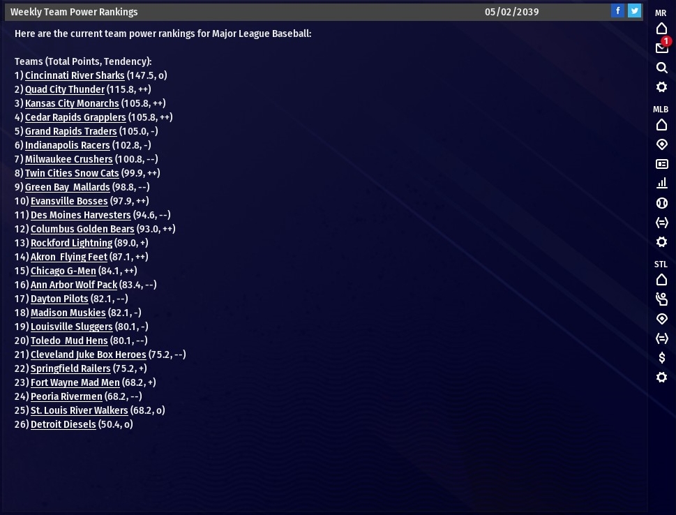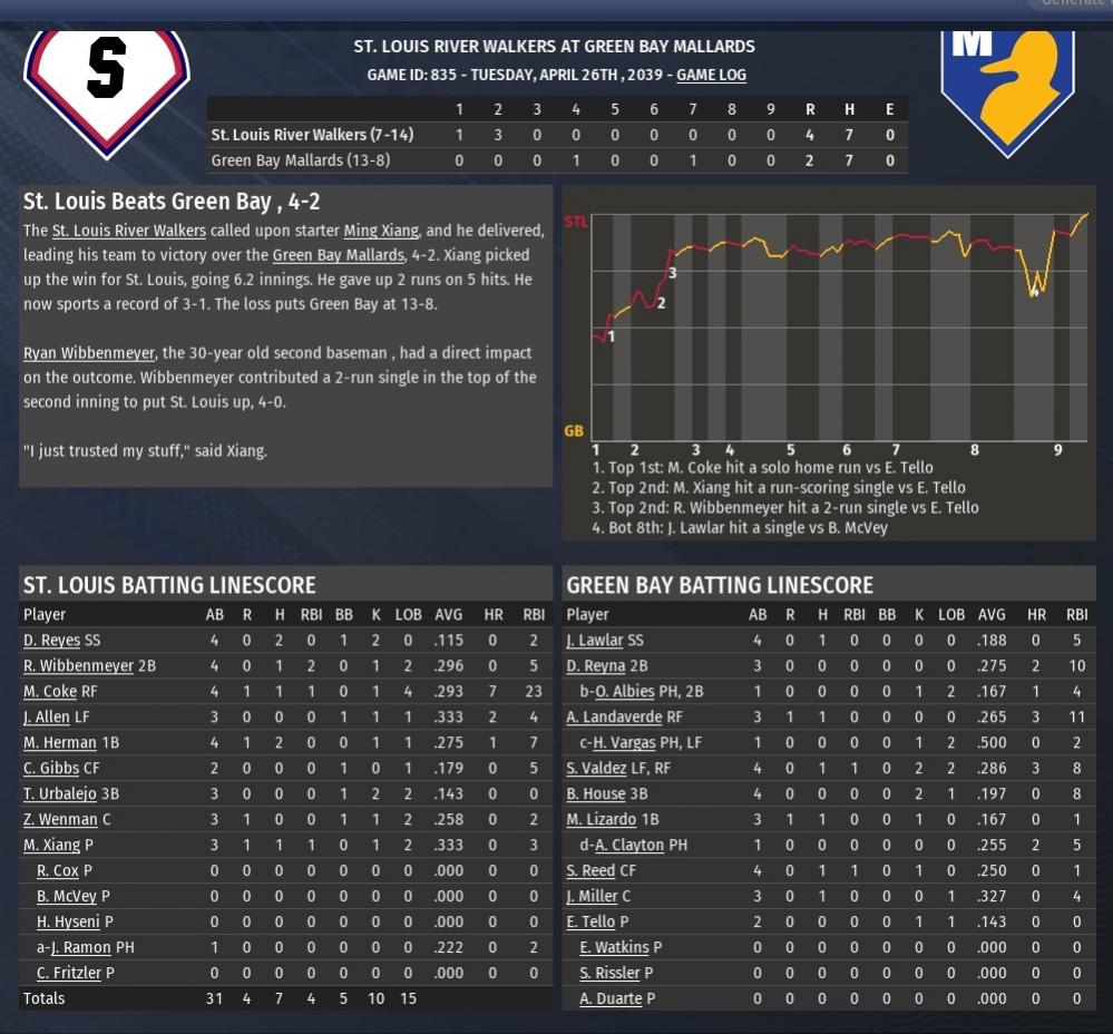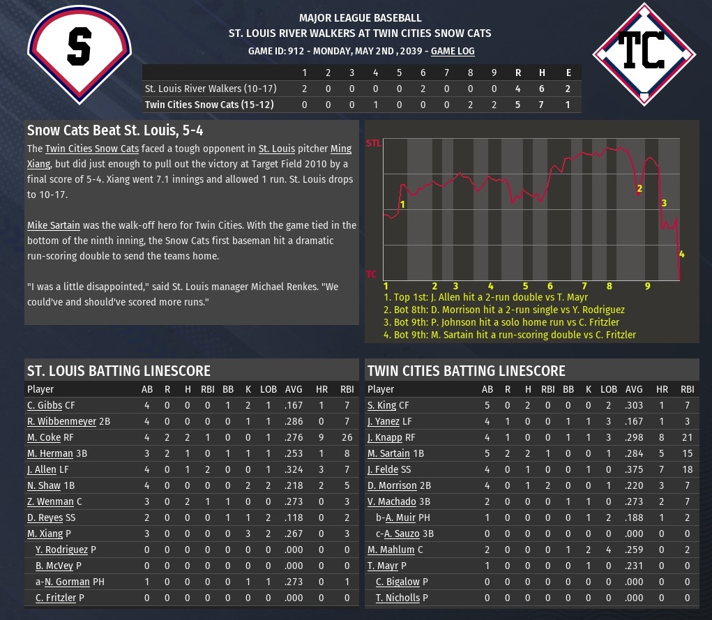 Twin Cities scored a pair of runs off St. Louis closer Craig Fritzler in the bottom of the ninth inning to defeat the River Walkers 5-4 at Target Field. Pinch-hitter Pete Johnson tied the score when he led off the inning with a homer to left field. It marked Fritzler's fourth blown save of the season, matching his total for the 2038 season. Juan Yanez later drew a one-out walk. Mike Sartain won it two batters later hitting a two-out double on the first pitch he saw. St. Louis led 4-2 going into the bottom of the eighth when the Snow Cats scored twice to pull within a run. Danny Morrison drove in both runs with a two-out single off River Walkers reliever Yelin Rodriguez. Rodriguez had entered the game after starter Xiang Ming struck out Juan Yanez to lead off the inning. Rodriguez came in and allowed all four batters he faced to reach base --two walks and two singles -- with Morrison being the hit which tied the game. Snow Cats starting pitcher Travis Mayr went five innings, allowing four runs on five hits. He struck out five and walked two. Chris Bigalow (0.2 IP) and Tristan Nicholls (0.1) combined to pitch a scoreless sixth inning . Mike Harney did the same in the seventh. Danny Patino (2-2) would earn the win after keeping the Walkers off the scoreboard in the eighth and ninth. |