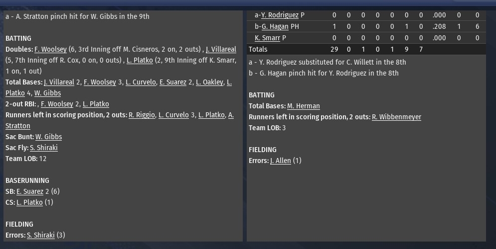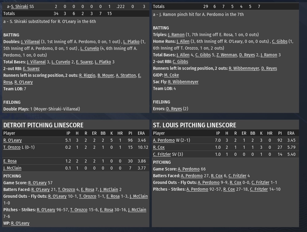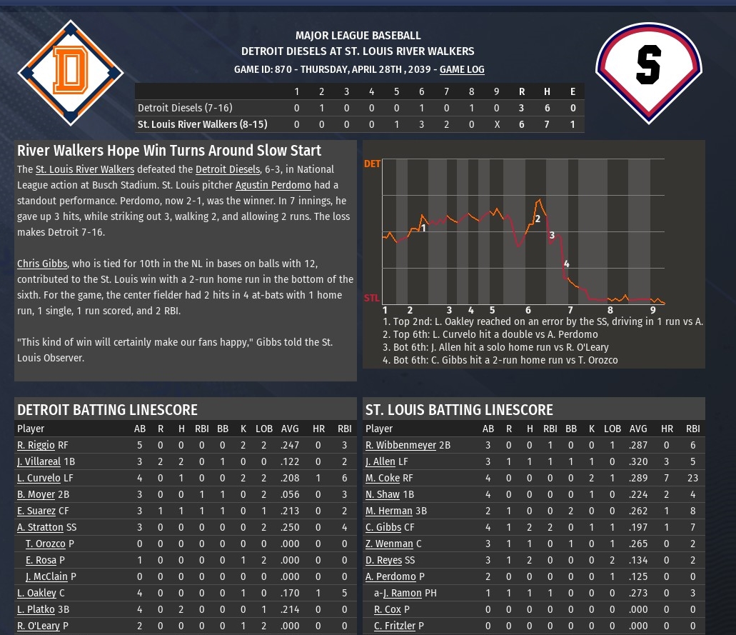 Wally Gibbs shutout St. Louis on one hit over the first eight innings and Detroit avoided a four-game sweep with a 6-0 win at Busch Stadium (2006). Gibbs (3-1) didn't allow a hit until Mark Herman reached on a one-out single in the bottom of the seventh. The right-hander exited after throwing 110 pitches through the first eight innings. He struck out eight and walked one. Matt Kelsh set the River Walkers down in order in the ninth to complete the shutout. The Diesels scored single runs in six different innings. They scored in the second, third and sixth off St. Louis starting pitcher Miguel Cisneros. Edgar Suarez singled with one out in the second. He stole second and scored on a Lance Platko single. Gibbs singled with one out in the third and advanced to second on an error by center fielder Joe Allen. Freddy Woolsey drove in Gibbs with a two-out double. Cisneros allowed three straight batters to reach to open the sixth, loading the bases. Shiju Shikari drove in Suarez, who had drawn a lead-off walk, with a fly ball to left. In the seventh, Jonathan Villareal led off with a double off Ron Cox and scored on a Laurenco Curvelo single. Roc Riggio drew a two-out walk from Chris Willett in the eighth. A wild pitch by Yelin Rodriguez moved Riggio to second. He scored on a Woolsey single. Lee Oakley drew a one-out walk from Kyle Smarr in the ninth. A Lance Patko double put Oakley on third. Shirkari collected another RBI when Oakley scored on a ground out. |