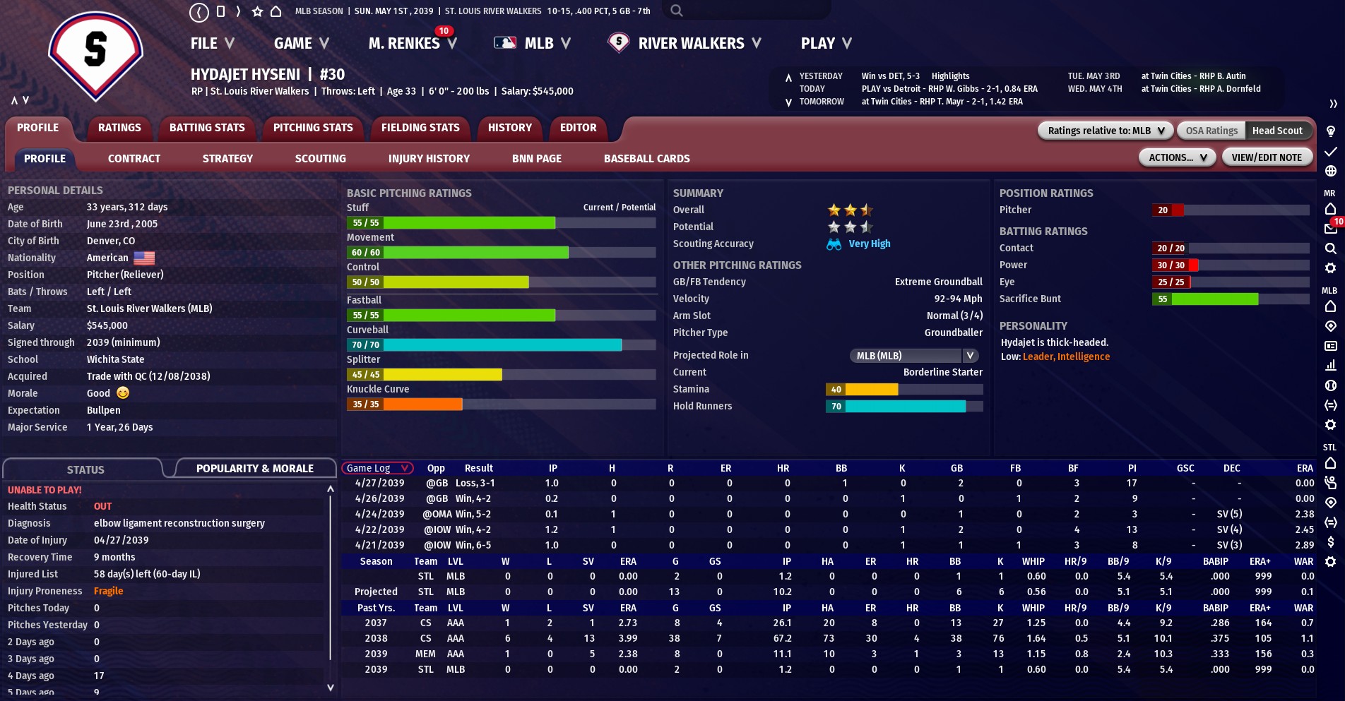 Hyseni last pitched on April 27 in a 3-1 loss to Green Bay. He left that contest with an elbow injury. He will undergo ligament reconstruction surgery in the near future and is expected to miss up to nine months. Hyseni, who St. Louis signed as a free agent in the off-season, pitched just 1.2 innings in his two games with St. Louis He had no record, struck out one batter and had a 0.60 WHIP. Getting called up from AAA Memphis will be 40-year-old lefty Yelin Rodriguez. Rodriguez has pitched in three games for the Redbirds. He has posted no record and worked five innings total. In that time, he has posted a 0.80 WHIP and struck out one. For his career, Rodriguez has pitched in 431 games at the major-league level, all in relief. He has a 23-14 record with eight saves and a 3.15 ERA. In 530.2 innings, he has struck out 408 batters and owns a 1.30 WHIP. |