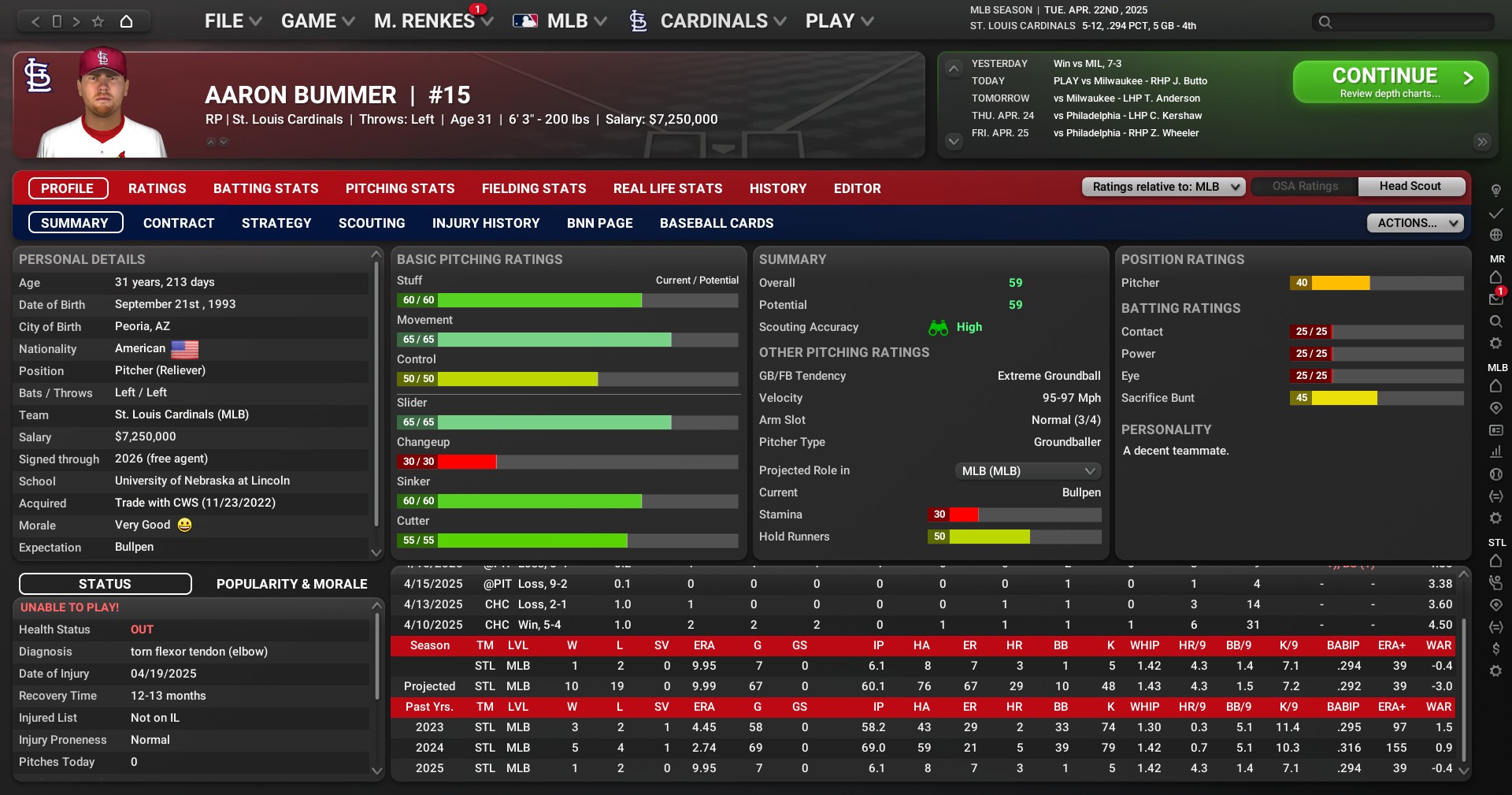 The 31-year-old suffered the injury in a 7-3 loss to Washington on April 19. In seven games this season, Bummer had gone 1-2 with a 9.95 ERA. He is expected to be out for at least a year. Getting called from AA is 31-year-old left-hander Jeff Singer. Singer has pitched in three games for the Cardinals posting no record in a 2.16 ERA. He has pitched in 60 games at the major-league level, all for Oakland, going 3-10 with a 5.67 ERA. |