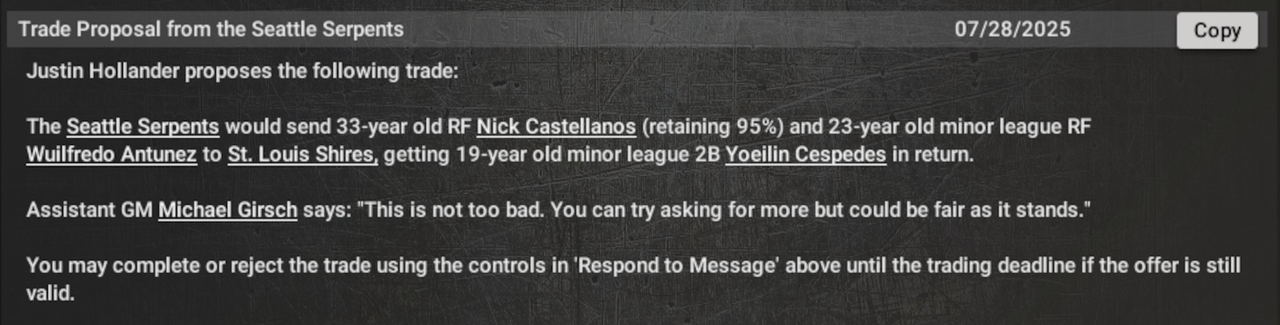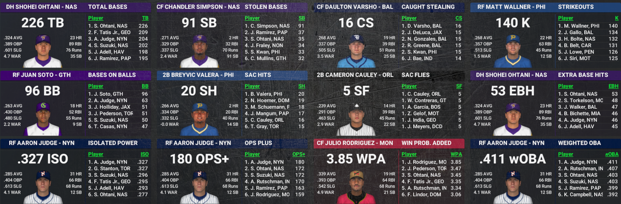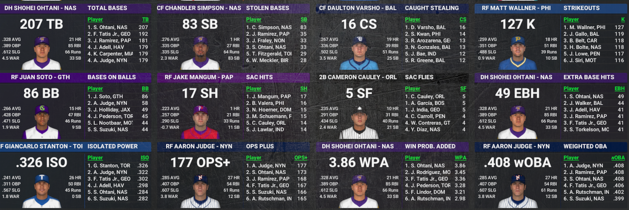 ---------------------------------- [1] Ju. Rodriguez (MON) - 8.8 [2] S. Ohtani (NAS)* - 8.2 [3] F. Tatis Jr (GEO) - 8.1 [4] F. Lindor (SDM) - 7.8 [5] A. Rutschman (IND) - 7.7 [6] Jo. Ramirez (PAP) - 7.6 [7] J. Pederson (TOR) - 5.6 * Nashville also has Seiya Suzuki, and he and Ohtani are combining for a serious Japanese Production Machine (they need a nickname) Ohtani ..... 316 - 26 - 96 Suzuki ..... 304 - 31 - 87 ![]() ![]() ![]() Quote: