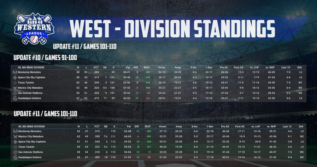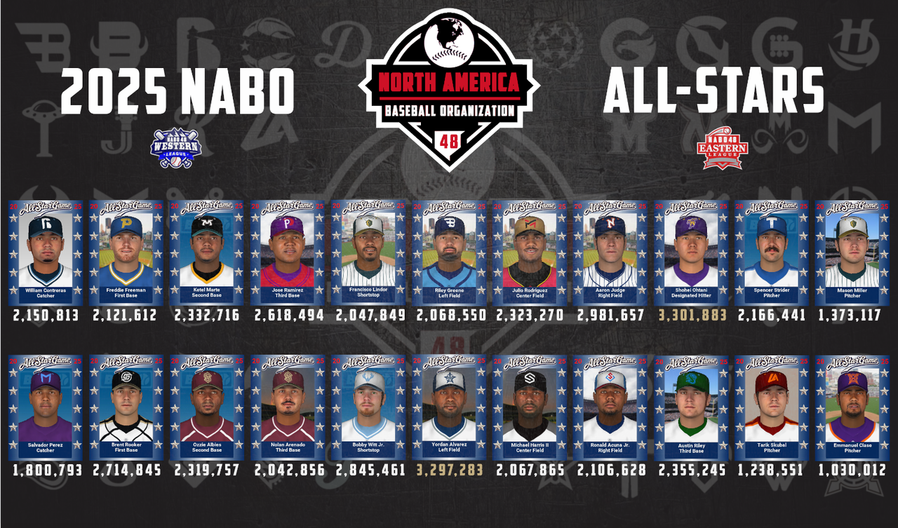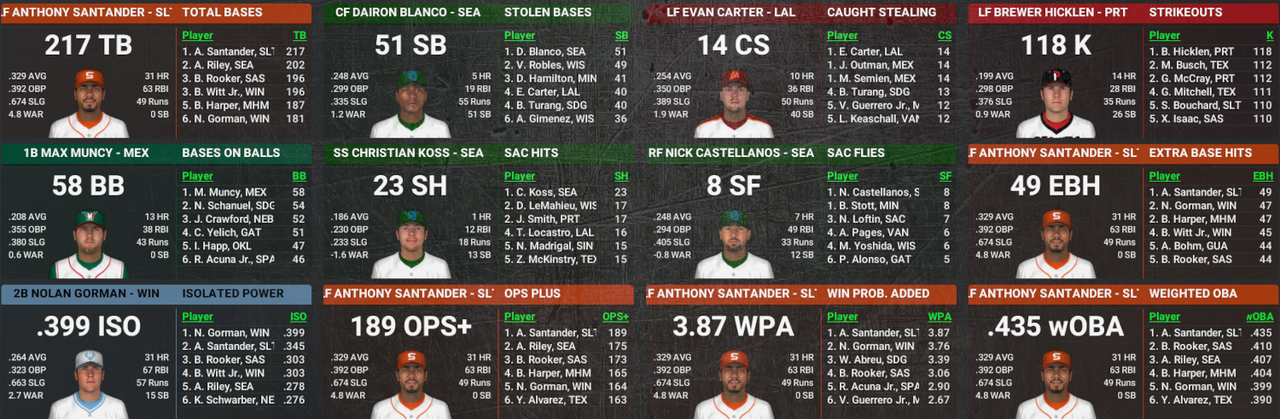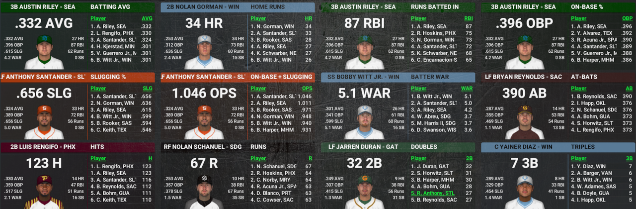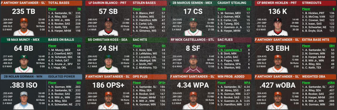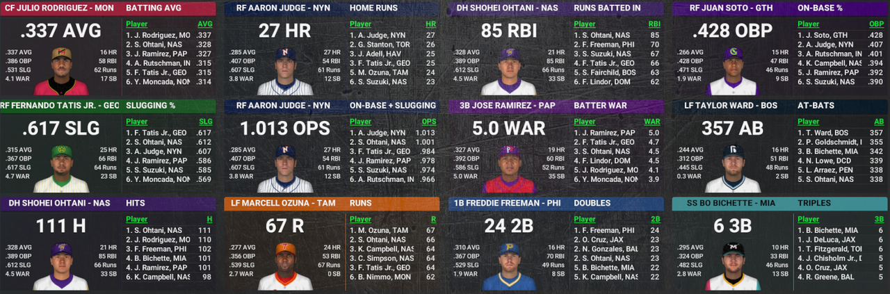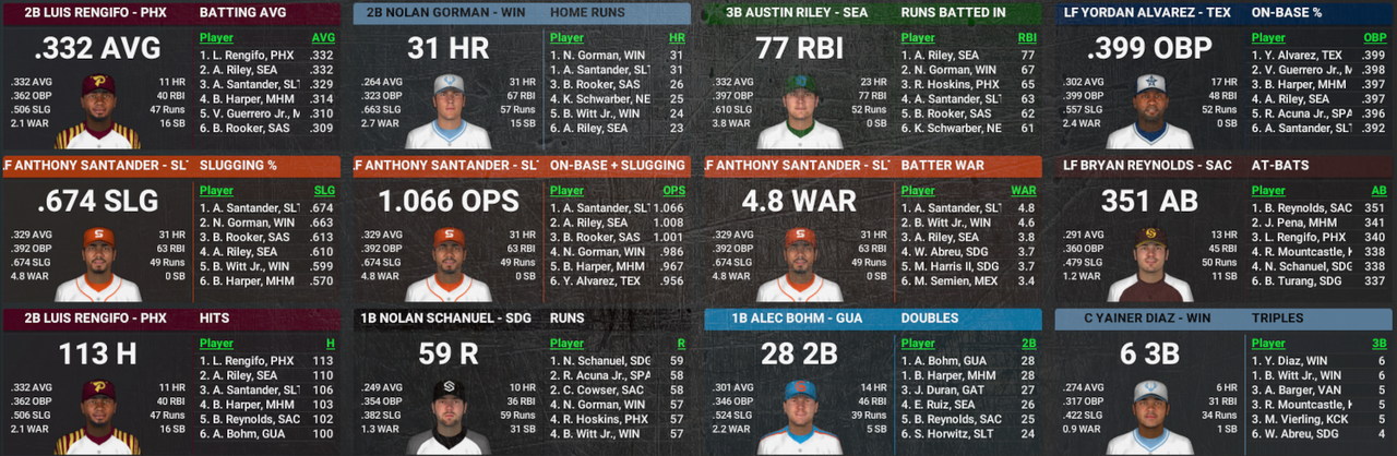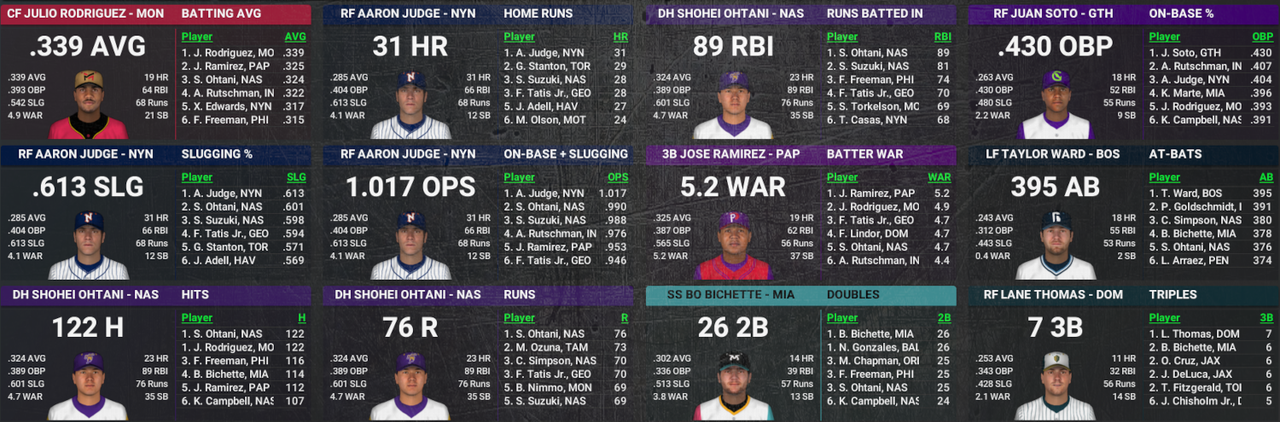 ![]() ![]() ![]() EAST - MVP RACE ------------------------------- [1] Ohtani - 8.4 [2] Tatis Jr - 8.1 [3] Lindor - 7.7 [4] J.Rodriguez - 7.6 [5] J.Ramirez - 7.5 [6] Moncada - 6.8 [7] Ruschman - 6.7 [8] Pederson - 5.2 ![]() ![]() ![]() WEST - MVP Race --------------------------------- [1] Santander - 8.7 [2] W.Abreu - 7.2 [3] Gorman - 6.5 [4] Rooker - 6.4 [5] Riley - 6.3 [6] Witt Jr - 6.2 [7] MHarris II - 5.9 [7] Acuna Jr - 5.9 [9] Guerrero Jr - 4.7 [10] Simien - 4.3 |