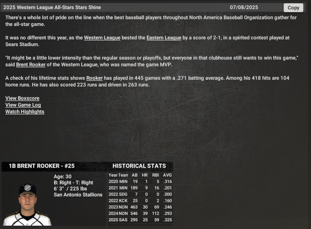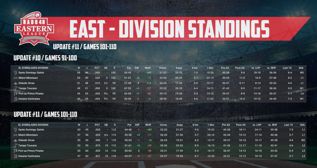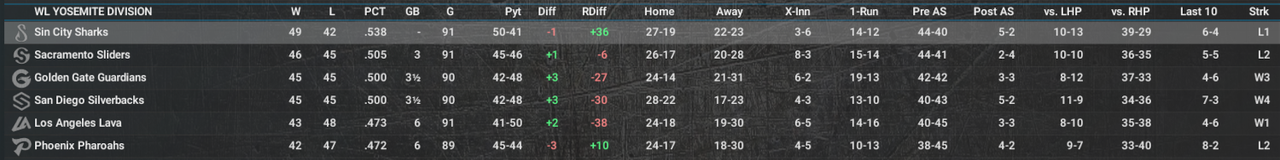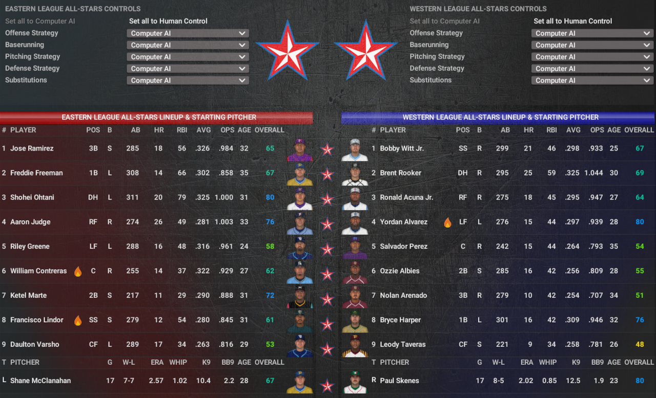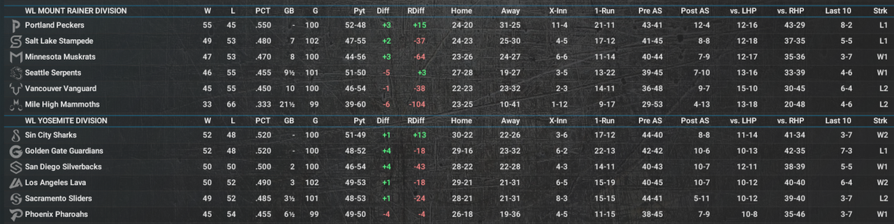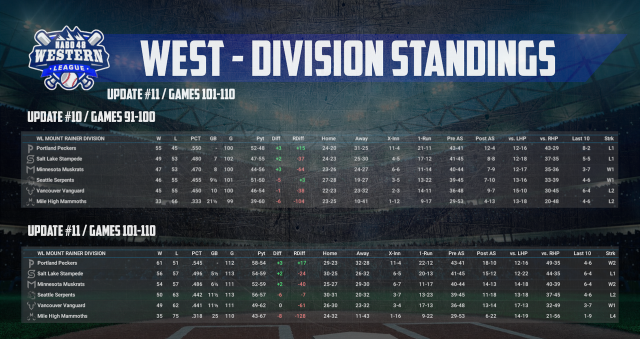 ![]() ![]() ![]() EAST - MVP RACE ------------------------------- [1] Ohtani - 8.4 [2] Tatis Jr - 8.1 [3] Lindor - 7.7 [4] J.Rodriguez - 7.6 [5] J.Ramirez - 7.5 [6] Moncada - 6.8 [7] Ruschman - 6.7 [8] Pederson - 5.2 ![]() ![]() ![]() WEST - MVP Race --------------------------------- [1] Santander - 8.7 [2] W.Abreu - 7.2 [3] Gorman - 6.5 [4] Rooker - 6.4 [5] Riley - 6.3 [6] Witt Jr - 6.2 [7] MHarris II - 5.9 [7] Acuna Jr - 5.9 [9] Guerrero Jr - 4.7 [10] Simien - 4.3 |