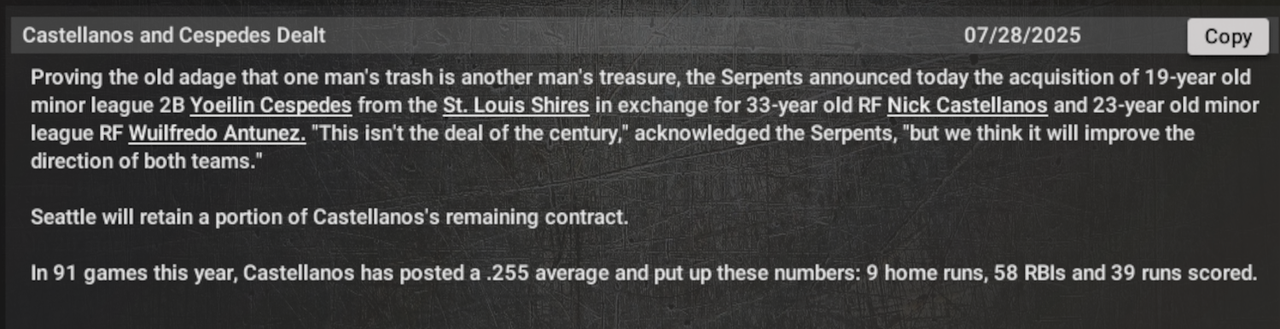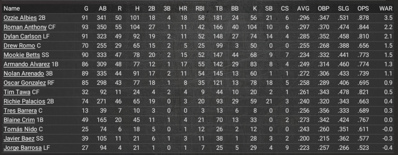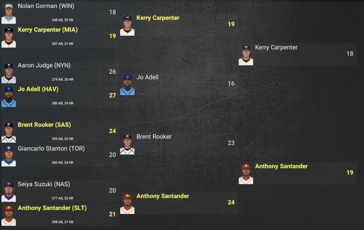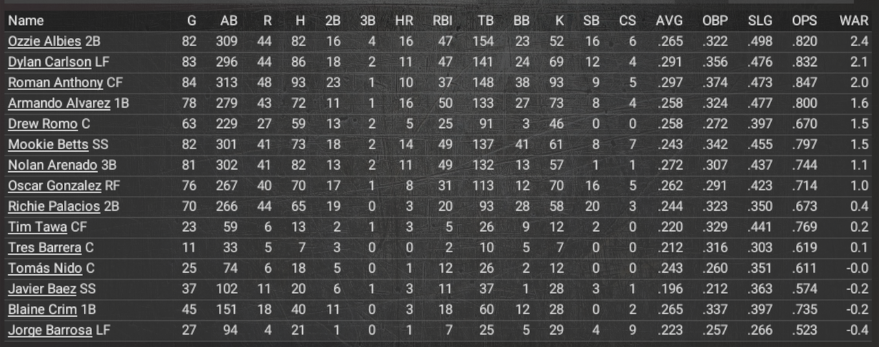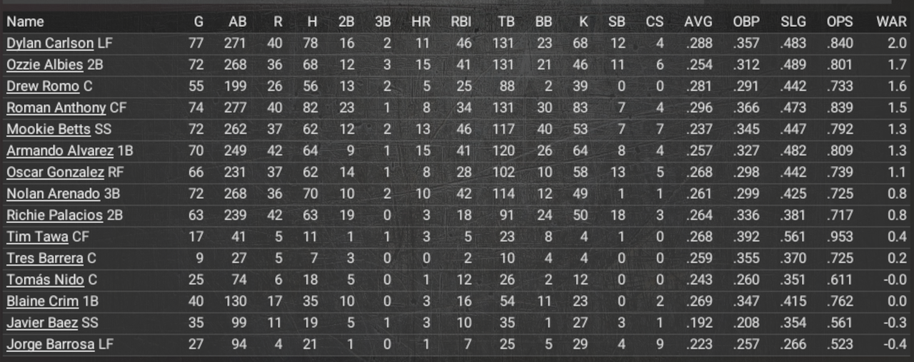------------------------------- [1] A. Santander (SAL) - 9.3 [2] W. Abreu (SDS) - 7.2 [3] A. Riley (SEA) - 7.0 [3] B. Witt Jr (WIN) - 7.0 [5] B. Rooker (SAS) - 6.4 [6] D. Hamilton (MIN) - 5.8 [6] M. Harris II (SDG) - 5.8 [8] V. Guerrero Jr (5.3) - 5.3 Last edited by circlechange11; 07-14-2025 at 10:42 PM. |