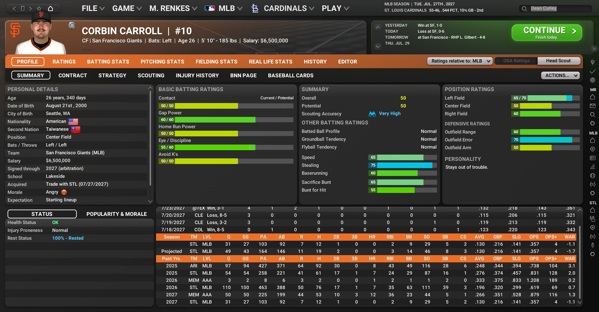 The Cardinals, who sit in second place in the National League Central Division some 10.5 games behind the Reds, right now sit second in the NL wild-card race. But they will likely be without right-handed starting pitcher David Matos until mid-September and already have a rookie Mike McGreevy in their rotation. Rozek, 31, has made six starts for the Giants this season going 2-2 with a 2.87 ERA. He also pitched in 13 games at AAA Sacramento, going 6-5 with a 5.21 ERA. For his career, Rozek has pitched in 91 major league games/45 starts and gone 14-23 with one save and a 4.34 ERA. He broke into the majors with the Twins in 2023. He also spent the 2025 season in Seattle before joining the Giants in 2026. The Cardinals acquired Carroll, 26, from the Arizona Diamondbacks during the 2025 season and he played a big role over the final 54 games helping them reach the playoffs and eventually win the World Series. In his 54 regular-season games with St. Louis during that year, he hit .276 with seven home runs and 24 RBIs. Hoping they had found their center fielder and lead-off hitter for the next few seasons, the Cardinals were deeply disappointed in his 2026 campaign when hit .196 with seven home runs and 35 RBIs in 110 games/100 starts. It didn't get any better in 2027 for the now 26-year-old, as he missed six weeks with a shoulder injury. And he did play, it wasn't good as Carroll hit an unsightly .130 with no home runs and two RBIs in 31 games/27 starts. In 50 games at AAA Memphis this season, Carroll hit .266 with 12 homes and 36 RBIs. Weathers, 27, also played a key role in the Cardinals run to the 2026 World Series title after being acquired in a mid-season trade. Brought in from Oakland, he pitched in 35 games/two starts that year going 2-1 with a 3.65 ERA. His numbers were almost identical in 2026, as he pitched in 56 games/9 starts and went 4-4 with a 3.65 ERA. Weather was given a spot in the rotation to start the season but failed miserably. He made seven starts and went 0-4 with a 7.82 ERA. Sent to the bullpen, he wasn't any better before eventually being traded. He worked 21 games in relief going 1-0 with a 7.06 ERA. |