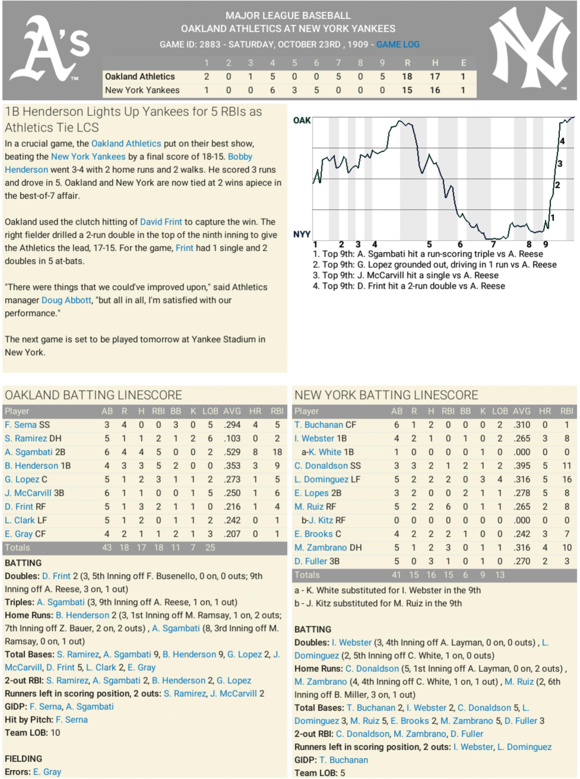 Despite a great game from Leo Dominguez, the Athletics rallied from an early 5-0 deficit to beat the Yankees and force a 1-1 tie in the ALCS.