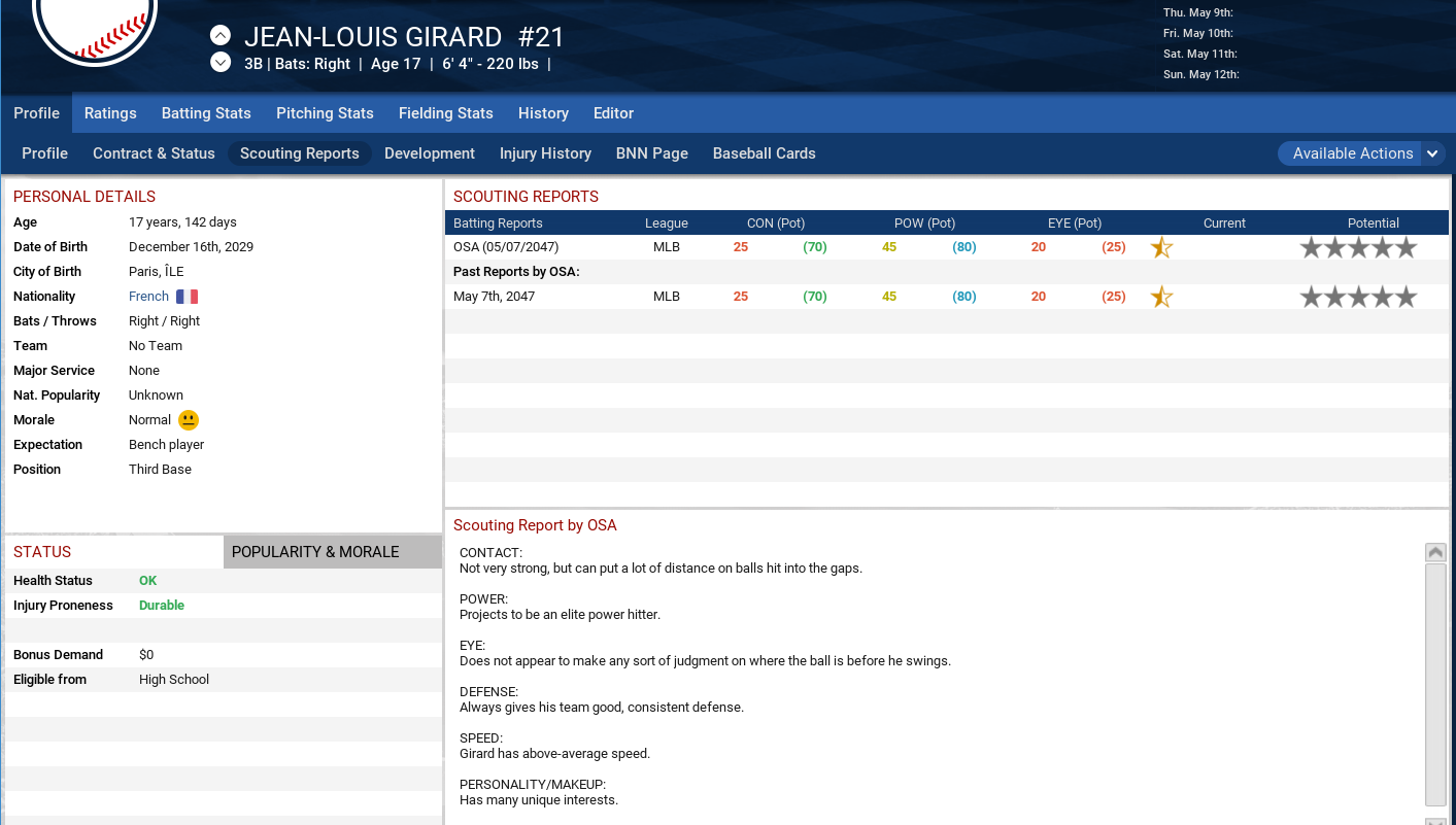 HS Bday: 1/21 Hometown: Paris, France Uniform Number: 21 Personality Attributes, pick 1-200 in each of the following, totals equal up to 1250 combined: Leadership: 200 Desire for Winner: 150 Loyalty: 50 Greed: 50 Work Ethic: 200 Intelligence: 200 Adaptability: 100 Controversy: 50 Handle Success: 100 Handle Failure: 100 Handle Critics: 50 Height: 6’4" Weight: 220 Bats: R Throws: R Position/Role: 3B, 2B BABIP: 60/200 Avoid K's: 15/90 Gap: 60/195 Power: 75/200 Eye/Patience: 15/90 Total = 225/775 Good defensively, but slower |