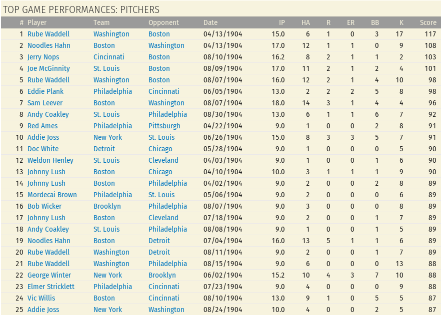 While several pitchers appeared multiple times on the list (Noodles Hahn, Johnny Lush, Addie Joss, Andy Coakley) the clear dominate pitcher here is Washington's Rube Waddell with four separate listings (117, 98, 89, and 88) on the top-25 list.