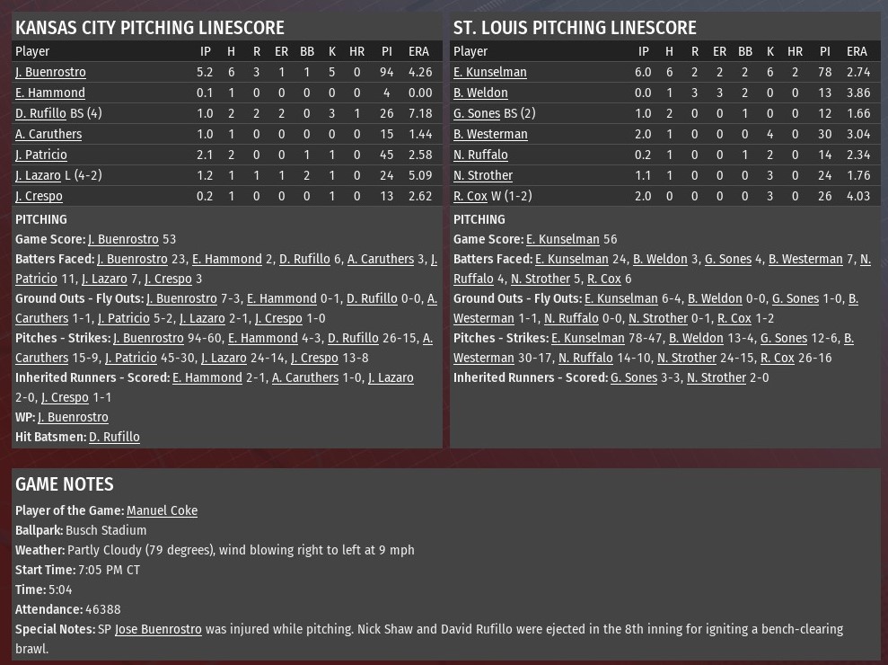 Kansas City jumped out to a 6-0 lead over the first 3.5 innings, and then held on to defeat St. Louis 7-6 at Busch Stadium (2006). The Monarchs quickly jumped out to a 1-0 lead in the top of the first inning against River Walkers starting pitcher. Nick Jernigan led off the game with a single, and on a steal of second ended up at third following a throwing error by catcher Jackson Miller. Jernigan scored on a Josh Shuler ground out. Jim Peebles led off the fourth with a homer off McDonald, paving the way for a three-run inning. After a ground out, T.J. Latham and pitcher Mike Tucker sandwiched singles around a double by Aljeando Crespo. Tucker's single scored Latham. Crespo found the plate on a fly ball by Jernigan. Jernigan collected two more RBIs in the sixth, hitting a two-run homer off reliever Brennan Weldon to make it 6-0. A two-run homer from Manuel Coke off Tucker ignited the St. Louis' comeback in the bottom of the sixth. A lead-off homer from Latham off Scott Rissler in the top of the eighth made it 7-2. It turned out the Monarchs would need that run. A Jose Segura two-run homer off Josa Lazaro in the eighth drew the Walkers with 7-4. Jackson Miller belted a two-run blast off Jose Patricio with no outs in the ninth, making it 7-6. Patricio, however, retired the next three for his 19th save of the season. Tucker (6-7) lasted five innings, allowing two runs on five hits. Four KC relievers, Yeison Rafael Sanders, Crespo, Lazro and Patricio, all pitched an inning to close out the game. |