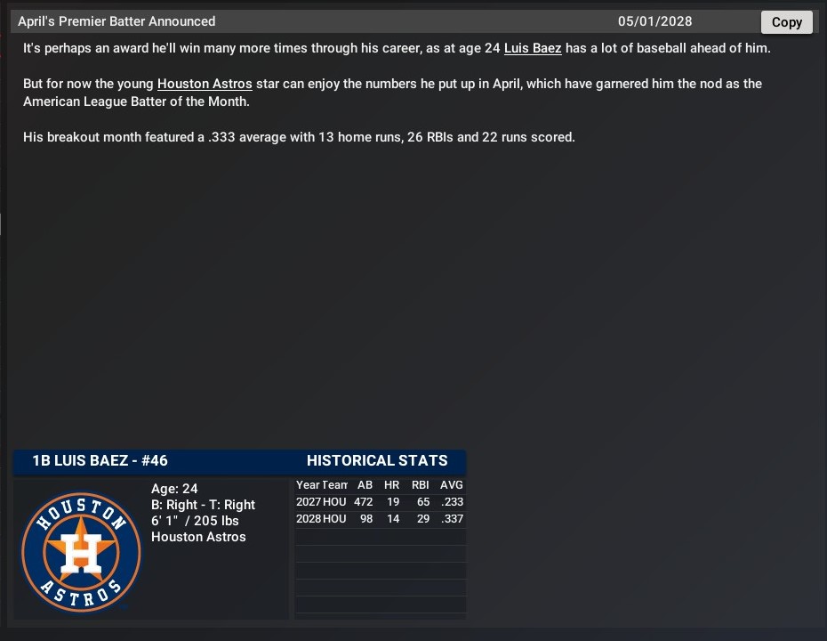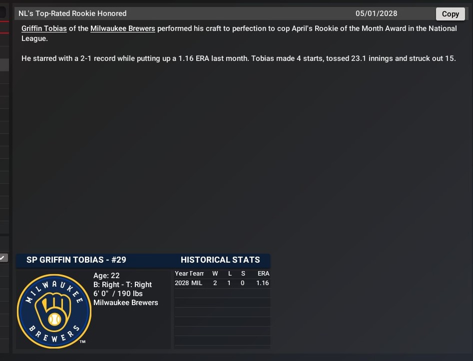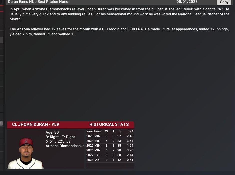 Starting Pitcher of the Month: Quinn Matthews -- The 27-year-old left-hander went 1-1 in six starts with a 3.82 ERA. He pitched a total of 33.0 innings, during which he struck out 38 and had a 1.33 WHIP. Relief Pitcher of the Month: David Bednar -- The 33-year-old closer pitched in 10 games notching saves in nine of them. He pitched a total of nine innings, during which he struck out 10 and had a 0.78 WHIP. |