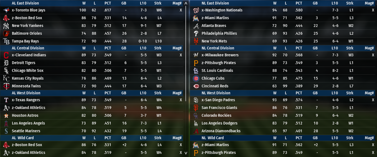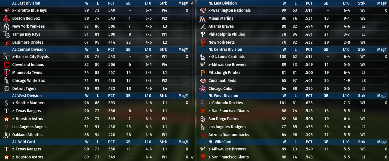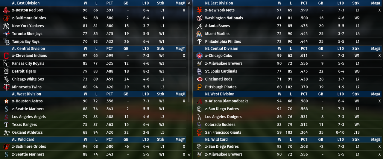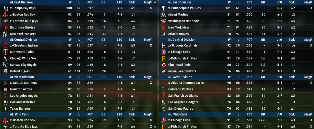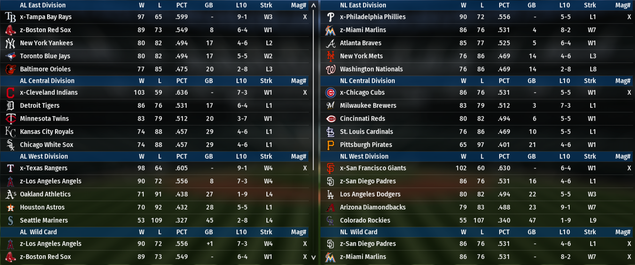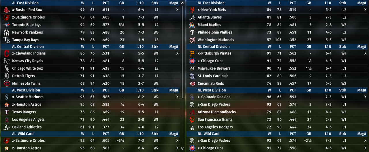 Cy Young: AL- Maldonado NL- Jon Saiz (COL) ROY: AL- Bobby Griffin (CWS) NL- Josh Dawson (PIT) HOF: Omari Christmon, Sullivan, Nakonieczny Regular season standings... ![]() Batting leaders... ![]() Pitching leaders... ![]() And playoffs... ![]() Really, Nats? A 99-win season and you don't win a goddamn game in the playoffs? Get. It. Together. |