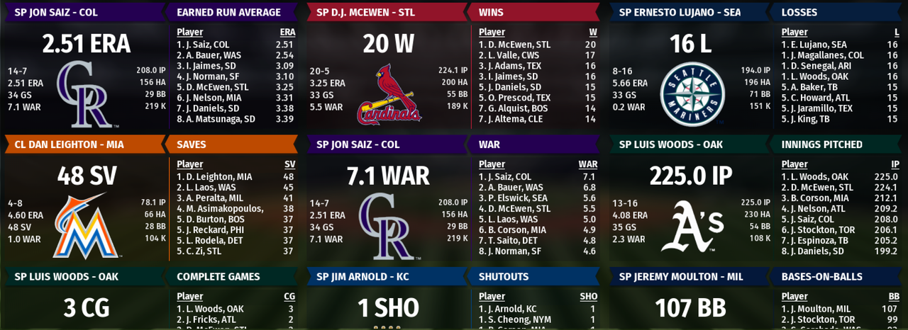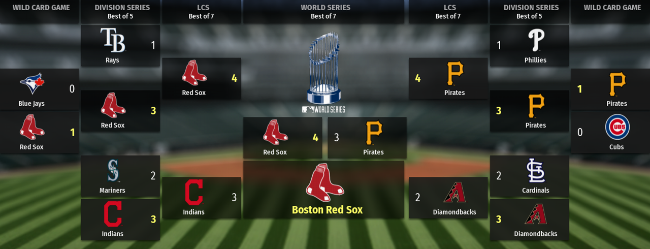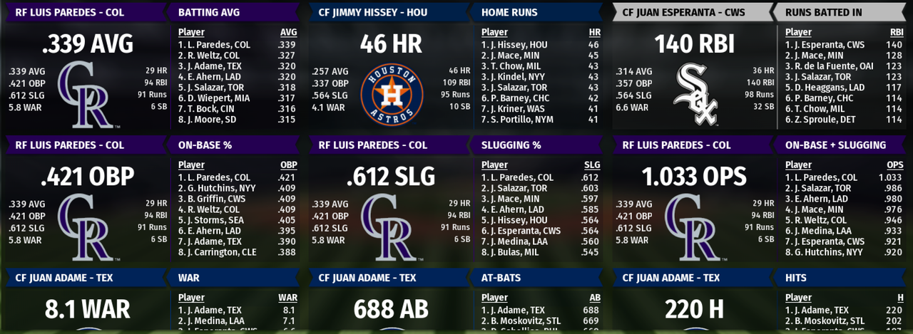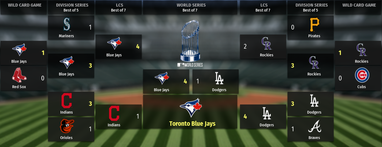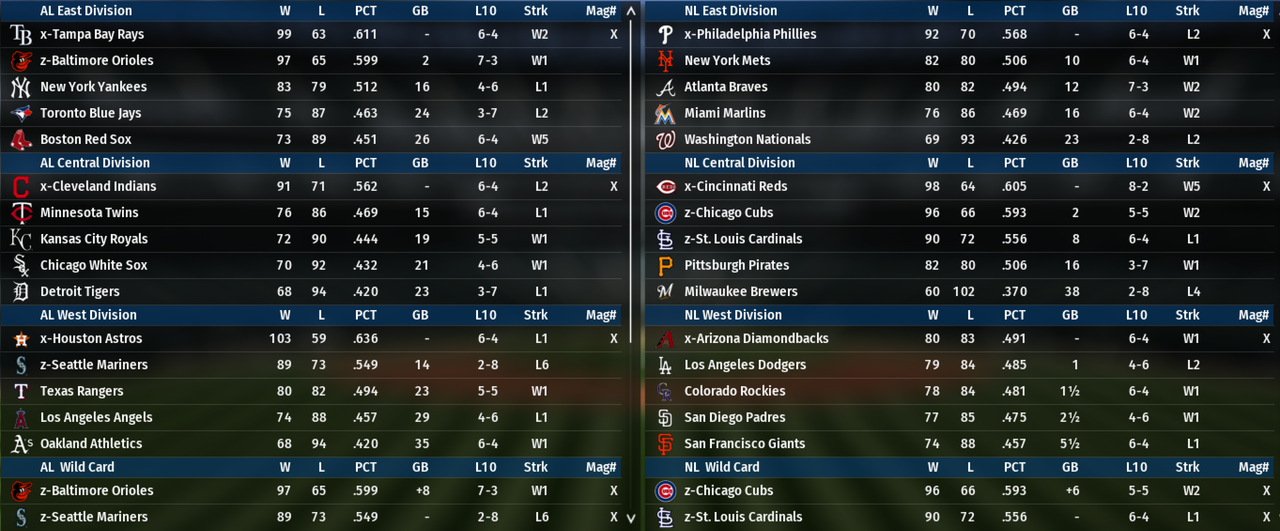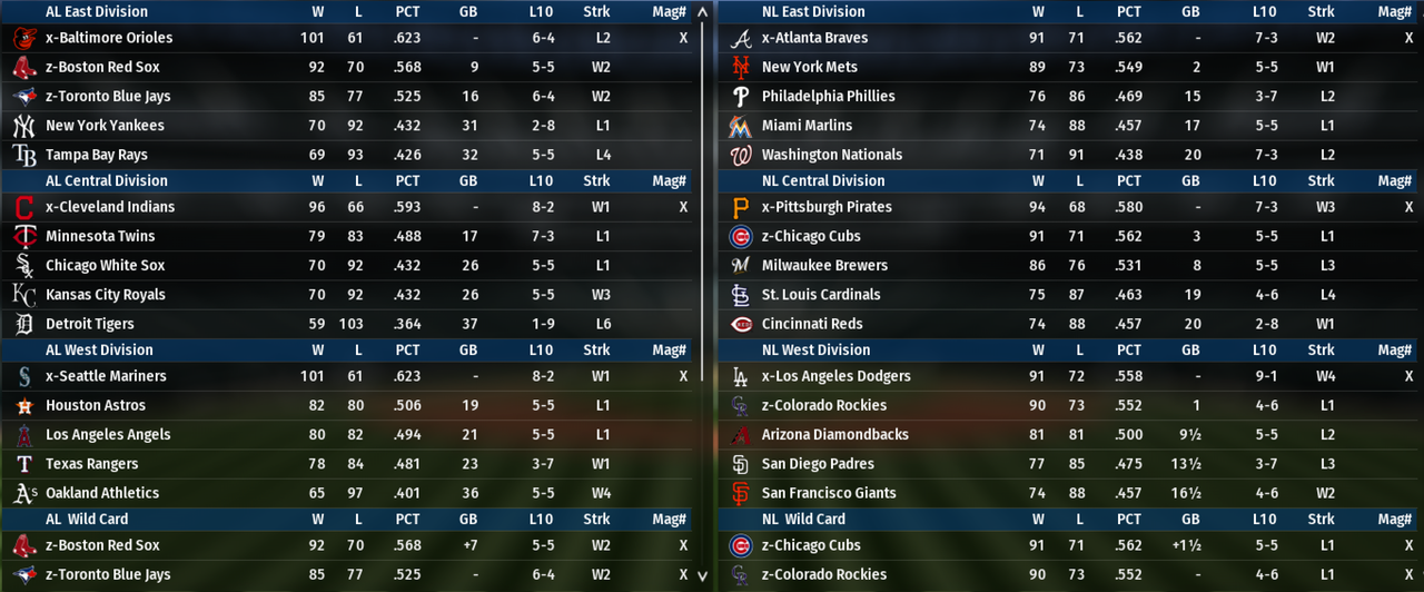 Cy Young: AL- Maldonado NL- Jon Saiz (COL) ROY: AL- Bobby Griffin (CWS) NL- Josh Dawson (PIT) HOF: Omari Christmon, Sullivan, Nakonieczny Regular season standings... ![]() Batting leaders... ![]() Pitching leaders... ![]() And playoffs... ![]() Really, Nats? A 99-win season and you don't win a goddamn game in the playoffs? Get. It. Together. |