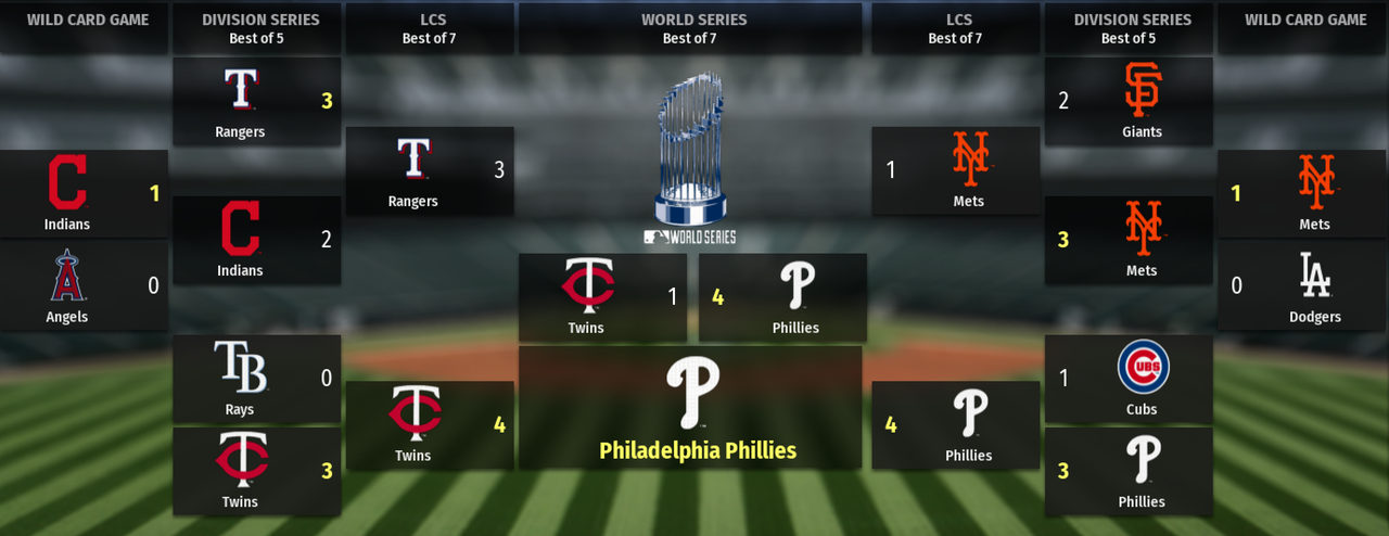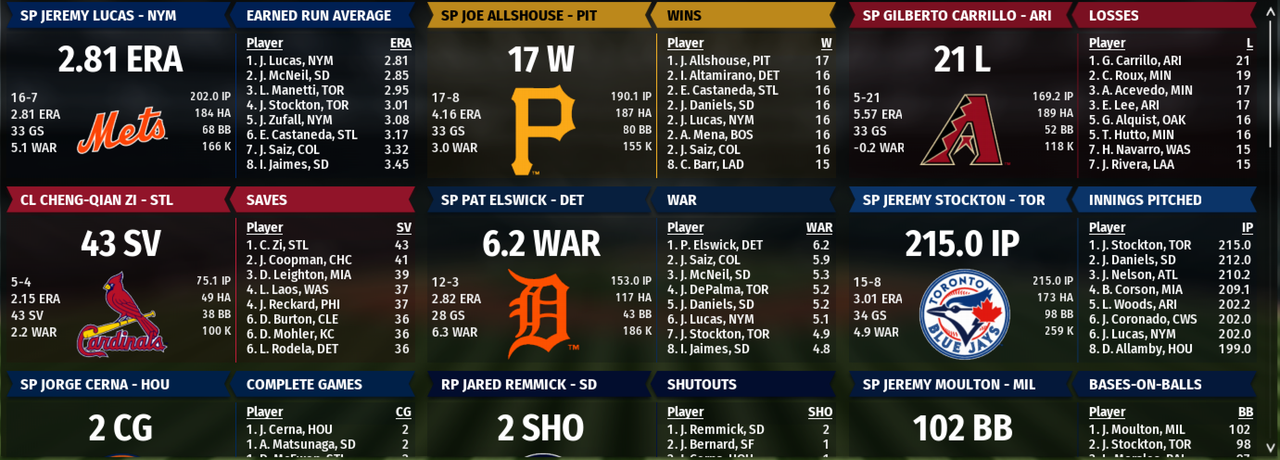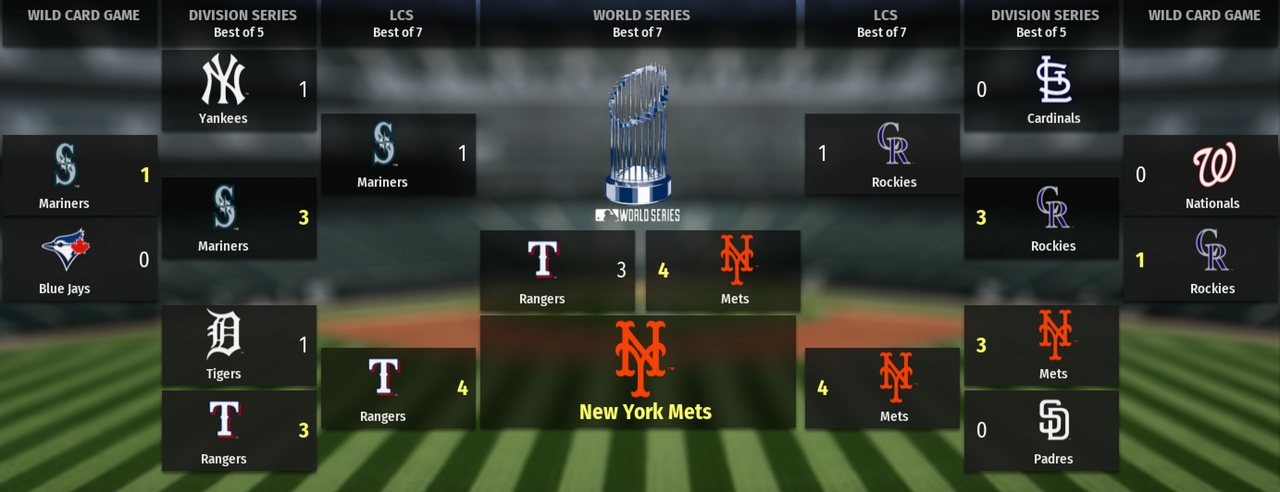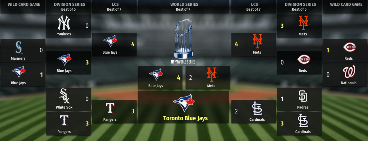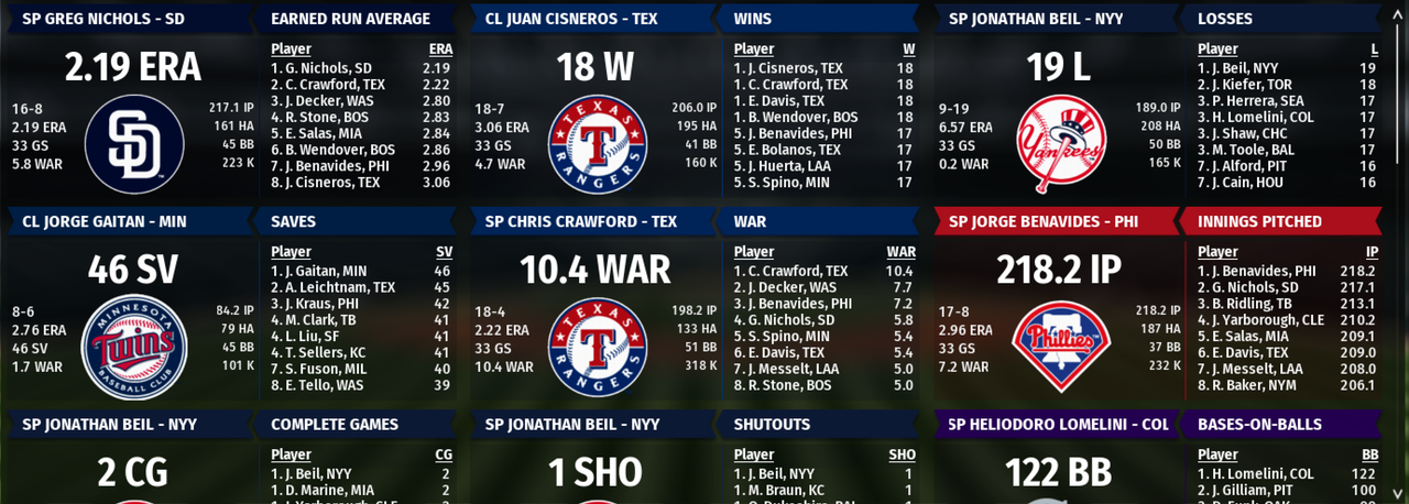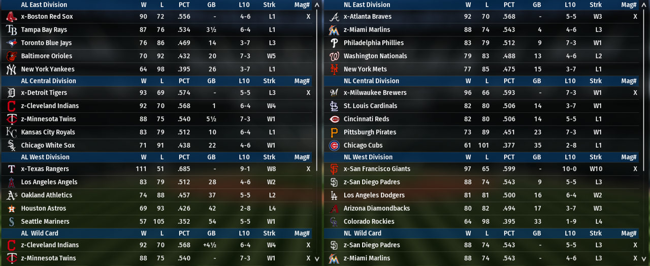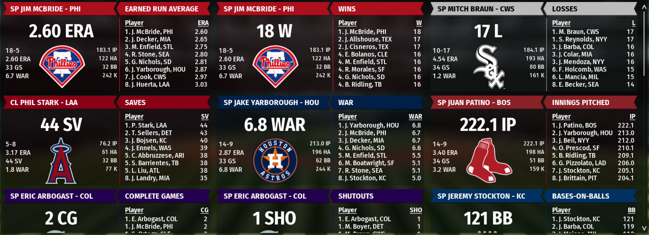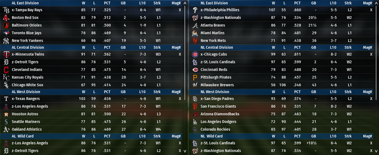 Cy Young: AL- Jake Yarborough (HOU) NL- Jim McBride (PHI) ROY: AL- Gualterio Asso (BOS) NL- Sergio Landeros Jr. (PIT) HOF: Serafino Soushina Regular season standings... ![]() Batting leaders... ![]() Pitching leaders... ![]() And playoffs... ![]() Nats miss playoffs again while their division rival wins another title. |