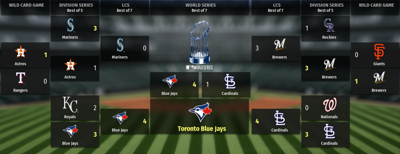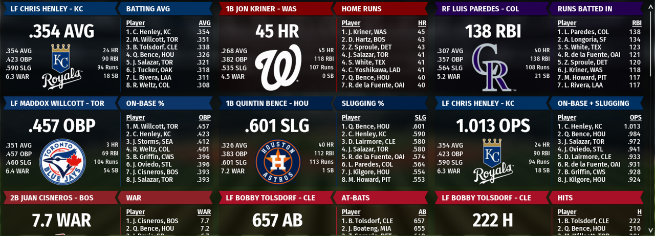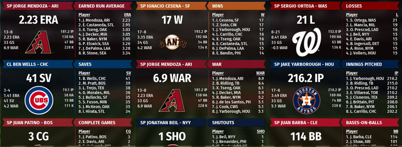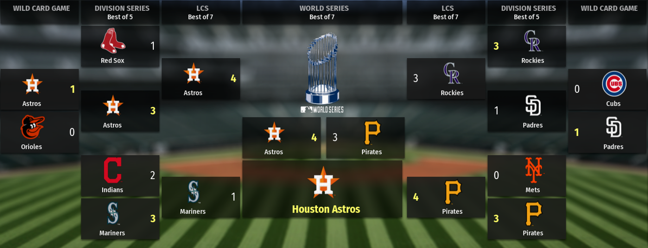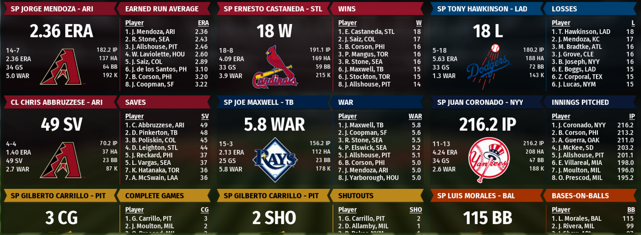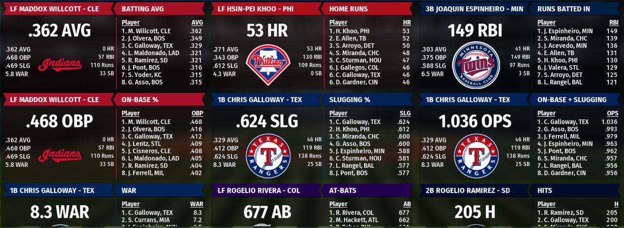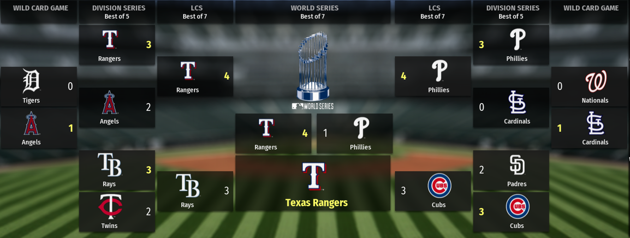 Cy Young: AL- Jake Yarborough (HOU) NL- Jim McBride (PHI) ROY: AL- Gualterio Asso (BOS) NL- Sergio Landeros Jr. (PIT) HOF: Serafino Soushina Regular season standings... ![]() Batting leaders... ![]() Pitching leaders... ![]() And playoffs... ![]() Nats miss playoffs again while their division rival wins another title. |
