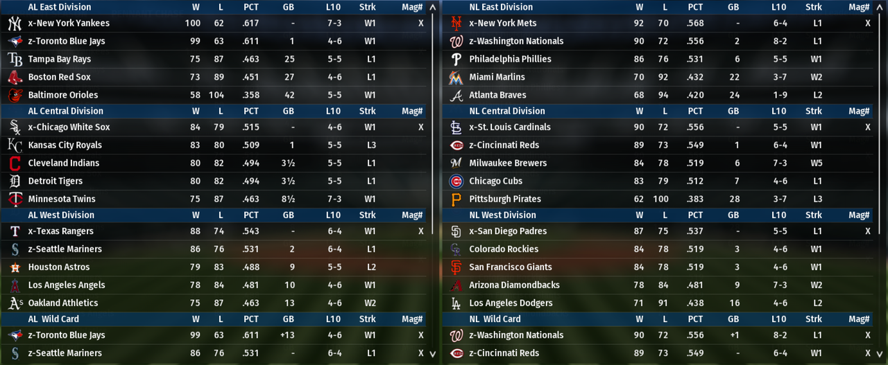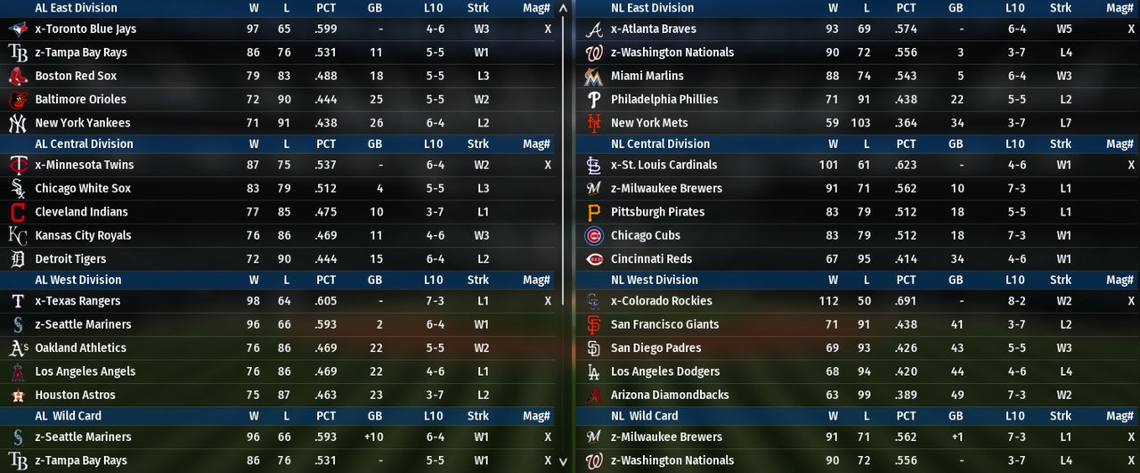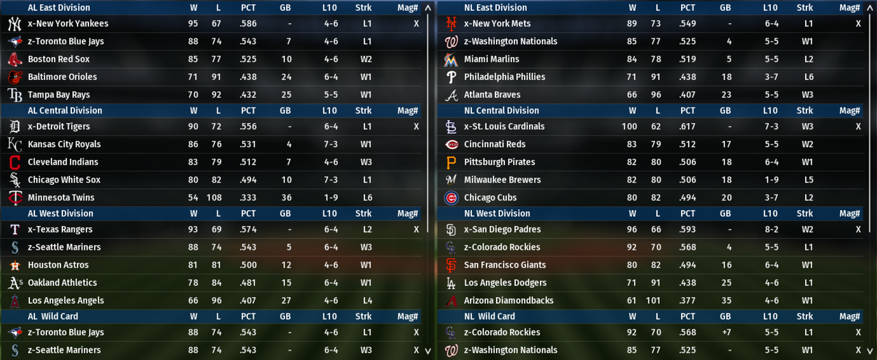 Cy Young: AL- Pat Mangus (CLE) NL- Decker ROY: AL- Chris Sturman (HOU) NL- Tim Tuttle (LAD) HOF: Arambula, Tafur Regular season standings... ![]() Batting leaders... ![]() Pitching leaders... ![]() And the playoffs... ![]() How do three NL East teams make the playoffs and yet none of them are the Nats? |