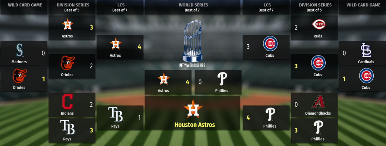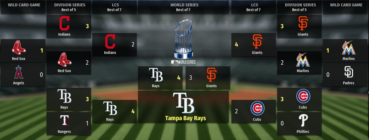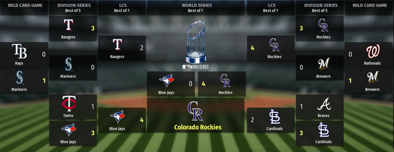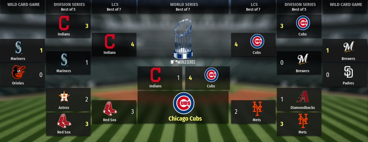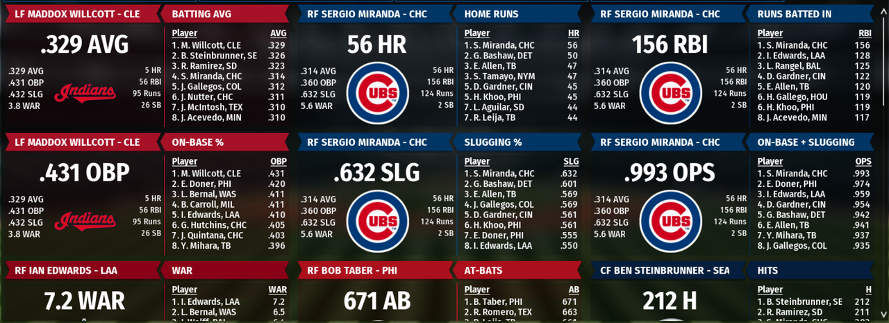 MVP: AL- Quintin Bench (HOU) NL- Jimmy Davis (SD) Cy Young: AL- Ed Newsom (SEA) NL- Saiz ROY: AL- Dave Boschert (TEX) NL- Sumiaki Murakami (PHI) HOF: Stach, Danny Hughes Regular season standings... ![]() Batting leaders... ![]() Pitching leaders... ![]() And playoffs... ![]() So the Cubs win (again), in a rematch of 2016. Meanwhile, the Nats (after a good start), fall back to .500. |