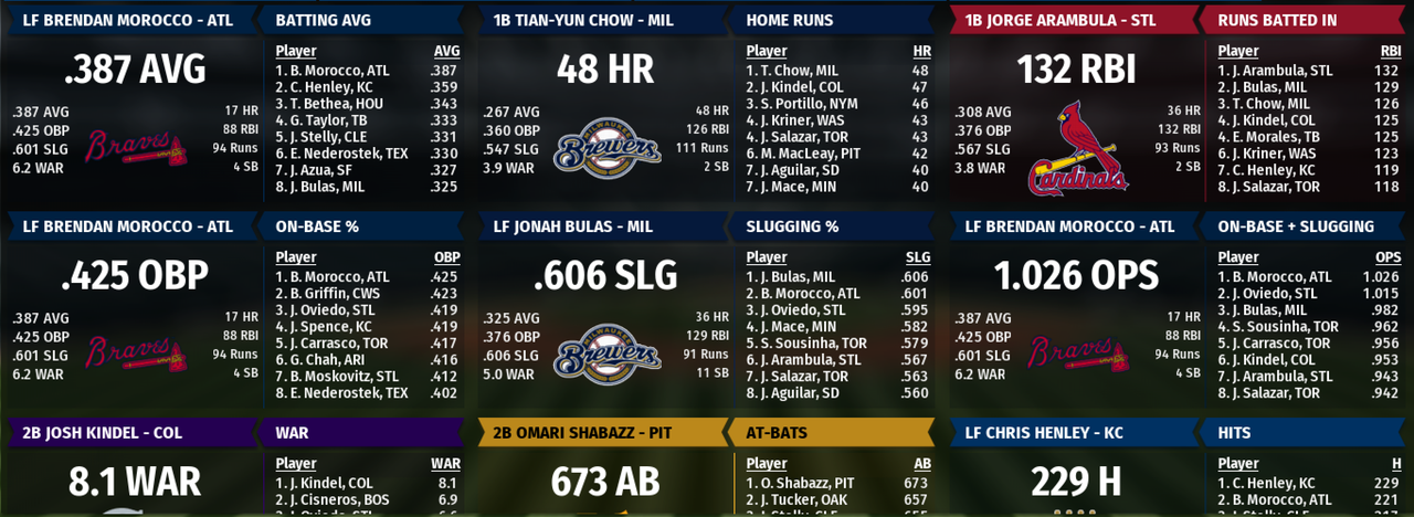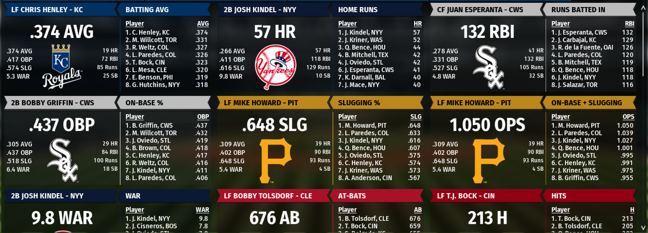 MVP: AL- Kindel (NYY) NL- Oviedo Cy Young: AL- Stockton NL- Saiz ROY: AL- Kieron Sandalls (HOU) NL- Ernesto Castaneda (STL) HOF: Pat Martin, Jorge Leal Regular season standings... ![]() Batting leaders... ![]() Pitching leaders... ![]() And playoffs... ![]() Wow. Just wow. (exits to right) |