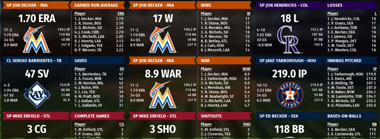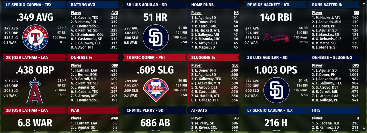Cy Young: AL- Chris Root (TEX) NL- Decker (who's now on the Nats...even that didn't help them) ROY: AL- Andy Carthon (TB) NL- Amari Zamor (MIL) HOF: Mike Asimakopoulos Regular season standings... ![]() Batting leaders... ![]() Pitching leaders... ![]() And playoffs... ![]() We keep going. |